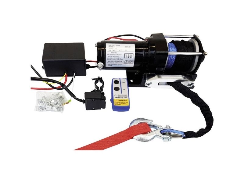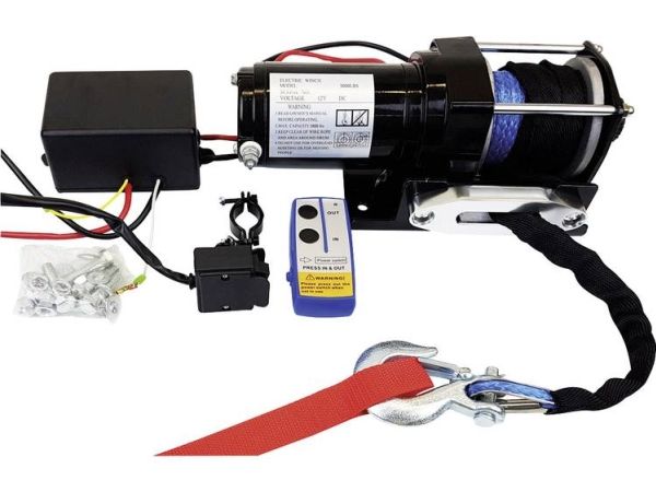 Tovspil 12 V 2700 kg syntetisk wire 12 V motortovspil med syntetisk reb, trækkraft på op til 2722 kg til bil eller særligt egnet til montering på quads, ATV (4x4) og erhvervskøretøjer. Elektronisk frem- og tilbagespoling via kabelfjernbetjening eller trådløs fjernbetjening. Manuelt friløb og automatisk bremse ved strømsvigt. Vigtigt: Rul aldrig kablet helt af, kun til den røde markering på rebet! 3-trins planetgear og alu-wievindue. Togets hastighed 680 kg - 2,4 m/min. Med udførlig monteringsvejledning. Specifikationer: Trækkraft 2722 kg ved brug af en styrerulle (medfølger ikke) Effekt: 900 W, 75 A Drevreduktion 153:1 Motor 12 V jævnstrøm 1,2 kW Mål 300 x 110x 105 mm Tromlemål 31,5 mm diameter - bredde 73 mm Syntetisk reb, 12 m længde, 4,8 mm diameter. Monteringsplade 124 x 76 mm. Vægt: 8 kg