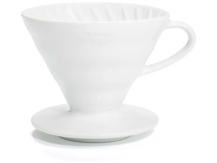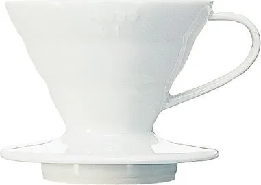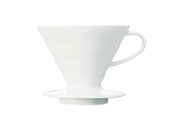 Hario V60 Coffee Dripper 02 Ceramic White VDC-02W\nThe V60 dripper, also called cup dripper or dripper mug is probably the best coffee dripper out there. The king of glass Hario has been manufacturing glassware since early 20th century and V60 set-up is one of their most popular brewing inventions. The bigger V60 02 size is preferred by cafes and baristas to brew 1 to 6 cups (depending on your cup size). The Hario V60 drippers retain the heat much better than a regular fan dripper. The Hario coffee dripper produces more extraction than the flannel filter and is delivered to you in a well packaged box with a FREE measuring spoon.\n\nCeramic V60 Dripper 02 Design\nV60 name comes from its design. The cone is V shaped and at 60 degrees angle. According to Hario research this is the optimal way to hand brew coffee. The V60 dripper has a single large hole, which allows you to determine the flavour of the ground coffee by adjusting the water flow. The Hario dripper has spiral ribs that maximise the expansion of the coffee by enabling air to escape while brewing.