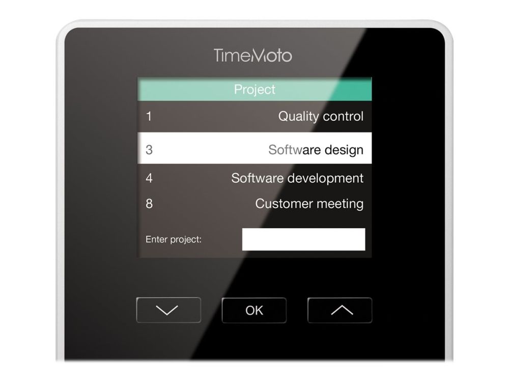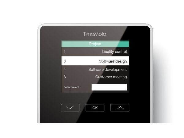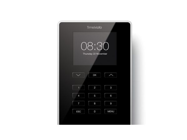 FUNCTIONAL DESIGN, BEAUTIFUL FINISH Enhance your company entrance or wall with the sleek yet durable TimeMoto TM-626. Its medium-sized 2.8” TFT display shows all information in crisp detail. Enjoy using TimeMoto’s beautifully designed time clock with easy-to-use intuitive interface. Enter project codes by pressing tactile keys. And at your employees’ fingertips are personal clock times and totals.