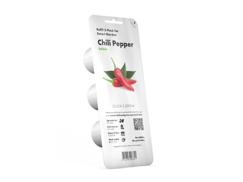 Experience the joy of growing your chilli peppers right at home with the Click and Grow Smart Garden Refill 3-pack - Chili Pepper. Designed specifically for use with the Click and Grow Smart Garden Starter Kit these capsules make it effortless to cultivate fresh spicy and flavorful chilli peppers to elevate your cooking and support your wellness.Easy-to-use plant capsulesIdeal for the Click and Grow Smart GardenCultivate fresh Chili Peppers at homePerfect growing conditionsEffortless gardeningEasy-to-use plant capsules Our plant capsules are easy to use ensuring a hassle-free gardening experience. Just insert them into your Click and Grow Smart Garden and watch your chilli peppers thrive. It's a simple process that brings the beauty of gardening into your home with minimal effort. Ideal for the Click and Grow Smart Garden Specifically designed for compatibility with the Click and Grow Smart Garden Starter Kit these refill capsules integrate seamlessly. They're essential for enthusiasts looking to expand their smart garden collection or replenish their existing setup. Cultivate fresh Chili Peppers at home Bring the heat to your kitchen with homegrown chilli peppers that add zest to your meals. These spicy delights enhance the flavour of your cooking and promote the body's ability to cope with heat and pain thanks to their natural properties. Perfect growing conditions Your chilli pepper plants will love the sunny spots of your smart garden encouraging them to ripen to perfection. The chilli peppers may take some time to mature fully with optimal growing conditions but your patience will be amply rewarded with aromatic and piquant peppers. Effortless gardening Thanks to the advanced Smart Garden cultivating your chilli peppers becomes effortless. Enjoy the benefits of home gardening without the traditional complexities and reap a bountiful harvest worth the wait. Package includes3-pack of Chili Pepper plant capsules for the Click and Grow Smart Garden.Product specificationsBiological name: Capsicum annuumCompatibility: Click and Grow Smart Garden Starter KitPlant type: Chili PepperPackage quantity: 3 plant capsulesRecommended environment: Indoor use
