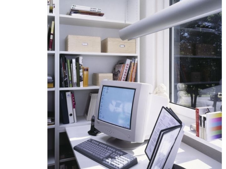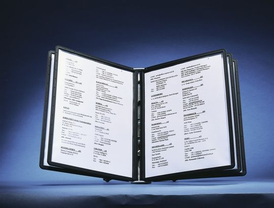 Space-saving table stand with 5 SHERPA display panels for presenting documents in A4 format.