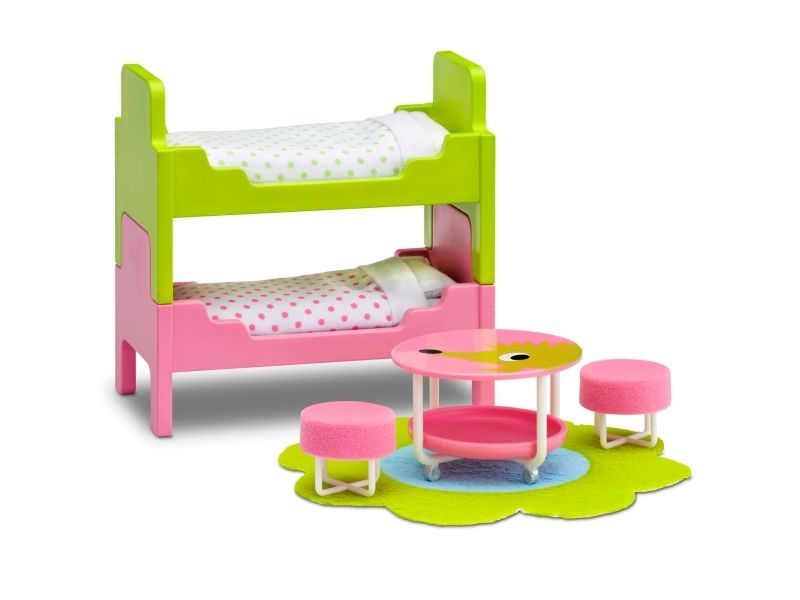 Populært barneromssett i lekre farger til Lundbys dukkehus! Settet består av en køyeseng som kan gjøres om til to enkeltsenger. Miniatyrbord med krakker og et herlig, mykt teppe kompletterer settet. Her kan dukkene lett krype under dynen og få seg en god natts søvn.