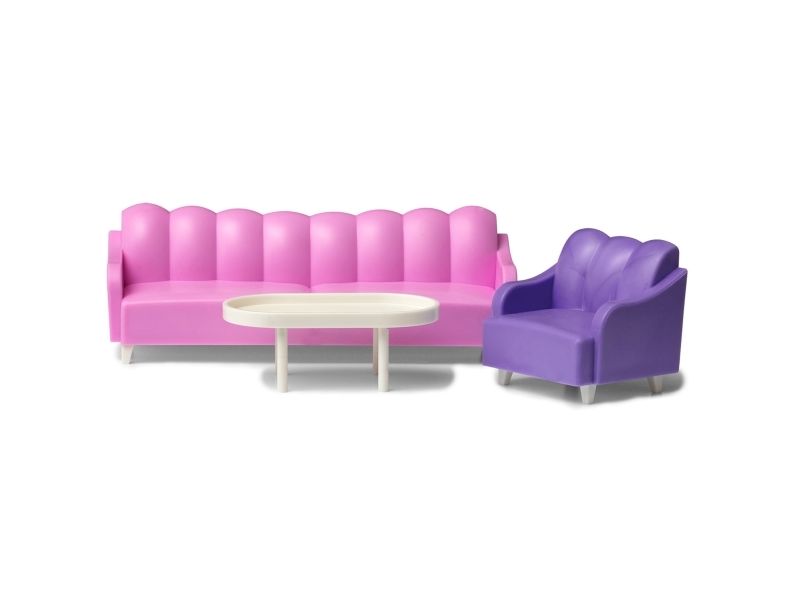 Plass til alle! I stuen kan dukkefamilien være sammen og ha det gøy. Den romslige sofaen og lenestolen gir plass til hele dukkefamilien. Sofaen og lenestolen er ikke bare pene, men også myke og behagelige å sitte i. Sofabordet har en liten kant som gjør at ting holder seg på plass. Svært praktisk, synes dukkefamilien. Med møbelserien Basic kan du raskt og enkelt møblere Lundby-dukkehuset i herlige pastellfarger.