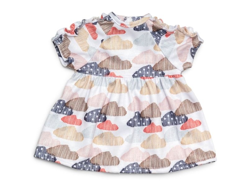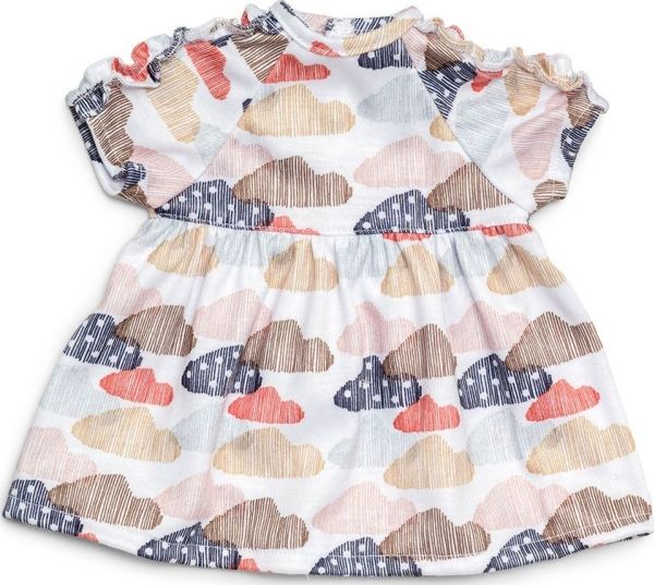 Dette er Lillans favorittkjole i myk jersey med fine volangdetaljer. Plagget har et trykk av skyer i ulike fargenyanser mot hvit bakgrunn. Denne kjolen kan brukes både til hverdag og fest!