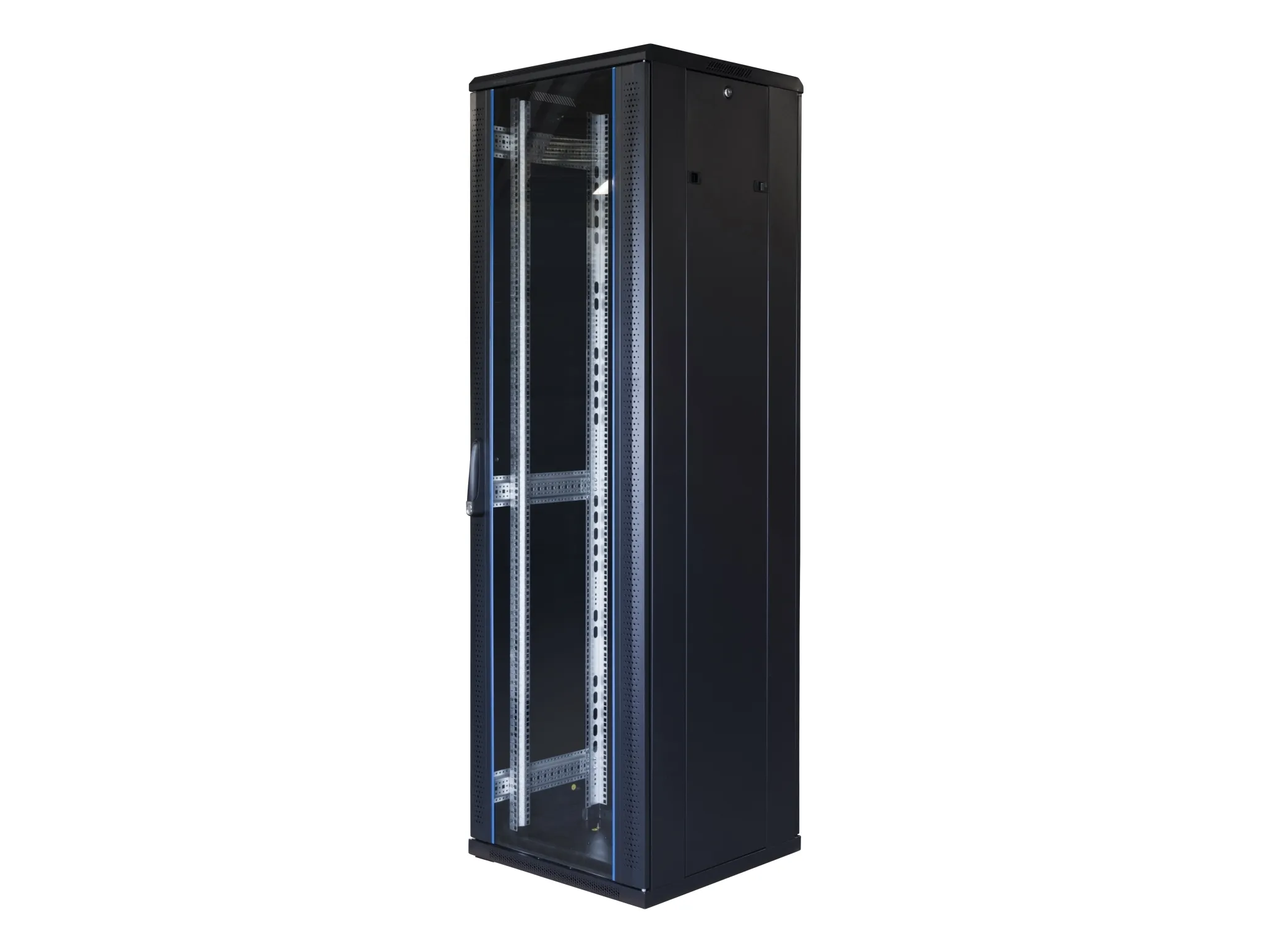 TOTEN System G, 19’’ gulvskab, 42U, 600x600, fordør af glas, bagdør af metal, 800 kg last, sort Maskinproduceret skab, hvor alle dele er skåret med laser, hullet med hydraulisk revolverstanse og svejset af robotter for at opnå ekstrem præcision.