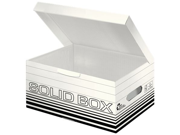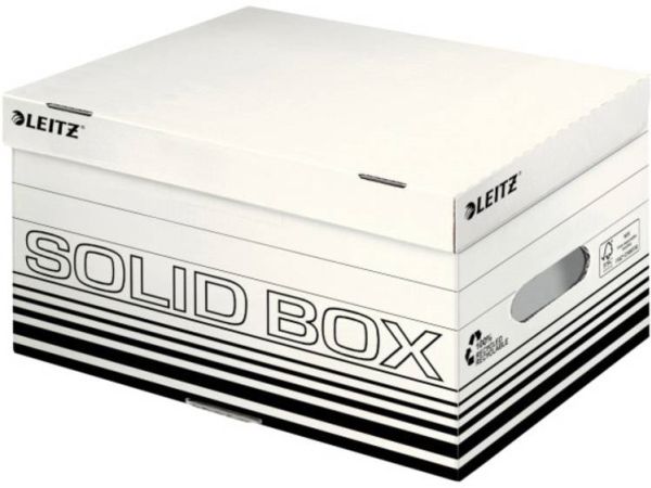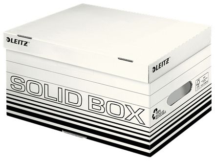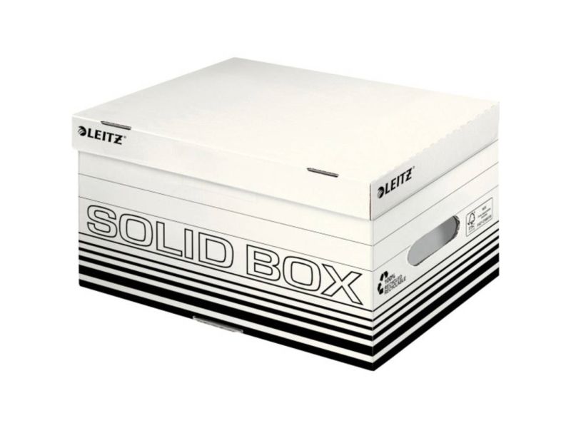 Leitz Solid Box er arkivering løsning til brug på kontoret eller derhjemme. Kraftigt materiale samt dobbelt bund og vægge gør den ideel til opbevaring, forsendelse eller transport af dokumenter og tunge ting. Med praktisk automatisk opbygning klar til brug på få sekunder. Ekstremt holdbar og stabil.