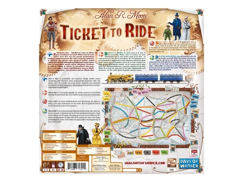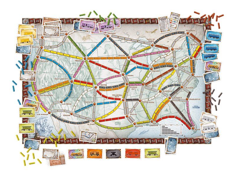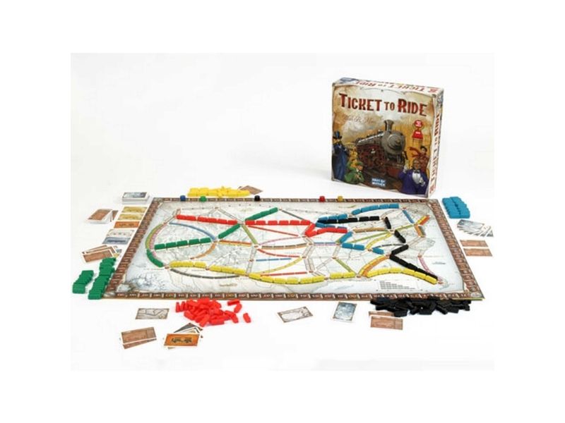Ticket to Ride is a cross-country train adventure in which players collect and play matching train cards to claim railway routes connecting cities throughout North America. The longer the routes, the more points they earn. Additional points come to those who can fulfill their Destination Tickets by connecting two distant cities, and to the player who builds the long continuous railway.