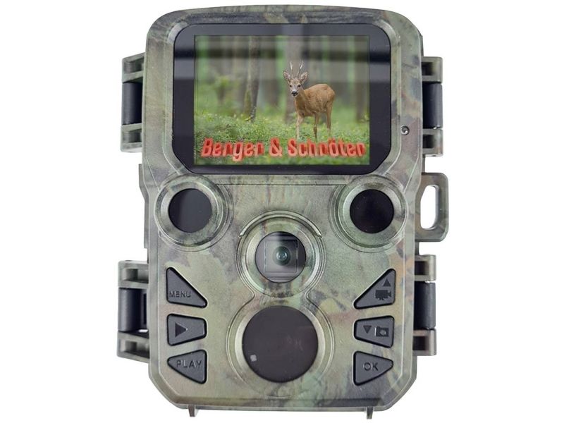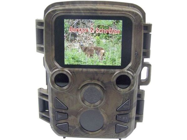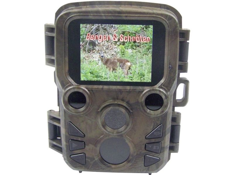 Berger & Schroter Mini 16 MP vildtkamera Trigger Time kun 0,45 sek. (ved 4GB Micro'erne kan anbringes SD-kort) · Objektivbrændvidde 3,62mm, 70° objektiv; automatisk hvidbalance · Video, enkeltbillede op til 3 billeder, eller enkelt billede + video per udløsning kan indstilles (videolængde 3 sek. til 10 min. kan vælges). Videoer med lydoptagelse fra 1920x1080/15fps, 1280x720/30fps, 720x480/30fps, 640x480/30fps, 320x240/30fps kan indstilles. · Dato, klokkeslæt, på hvert billede. Timer- eller tidsforskudt indstilling mulig. PIR-bevægelsessensorer (intensitet kan indstilles) · PIR med 40° registreringsvinkel · Adgangskodebeskyttelse · Drift alt efter standby-tid via 4 Alkaline AA-batterier, medfølger ikke) eller 6 V med maks. 2 A · Vejrbestandigt kabinet IP54 · USB-kabel til tilslutning til billedoverførsel til din PC · Rem til træ fastgørelse og vægbeslag. ekstremt små mål ca. LxBxH = 105x80x40 mm inkl. Batteriboks · Menu på flere sprog D, GB, F, E, I, P, NL, DK, FIN, S, CN. Mini Full HD vildtkamera, 940nm black-LED'er helt usynligt, 16 megapixel (også 12 MP, 8 MP, 5 MP, 3 MP, 1 MP kan indstilles) med 1,77 TFT-skærm, er enkelt at placere på lokkemaden eller på vekslet. 24-timers døgnet rundt billeder og videoer. I farve om dagen og om natten med 2 højtydende black-LED'er (Blitzrækkevidde ca. 20 m) i sort/hvid, og derfor ingen verschrecktes vilde!