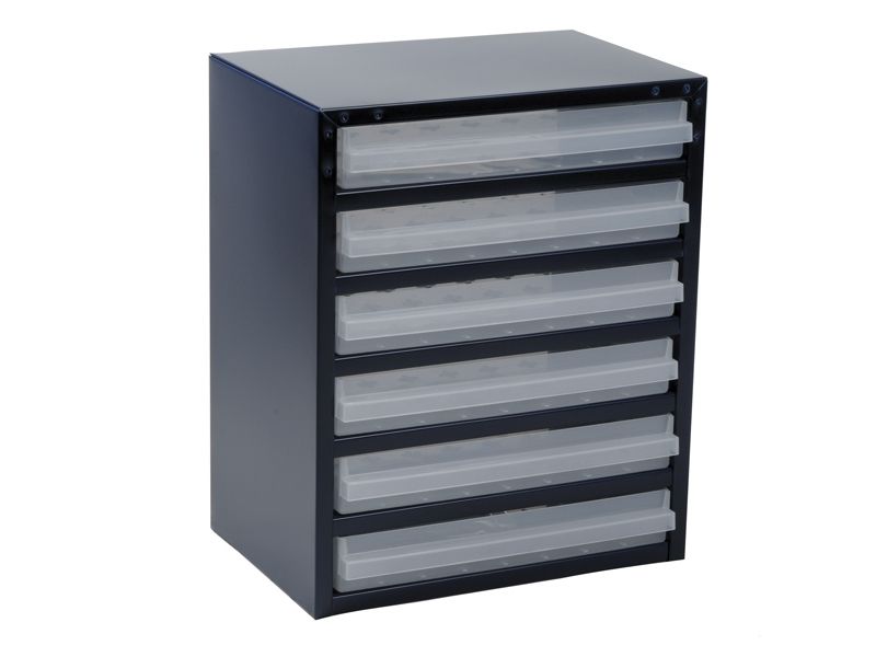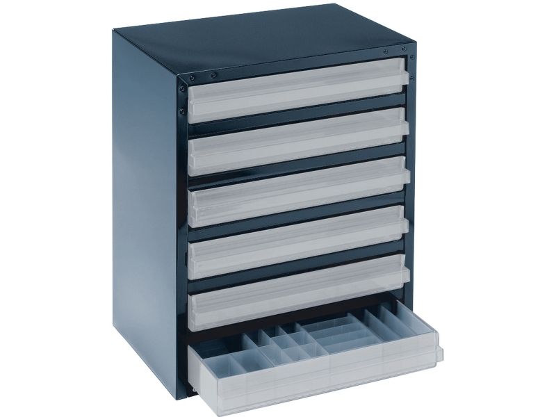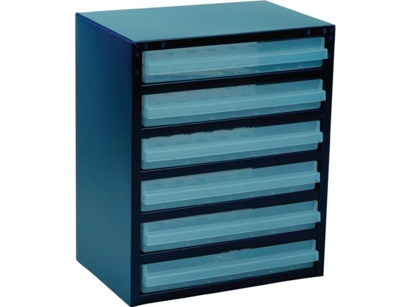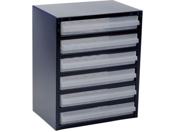 Cabinet with 6x250-3 drawers. Each drawer can be sub-divided using inserts. Cabinet made of painted steel and drawers made of polypropylene (PP). Each drawer can be sub-divided using inserts.