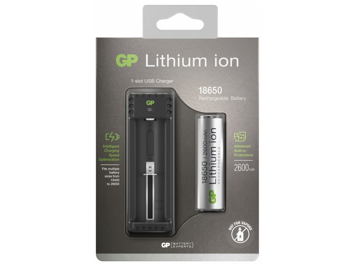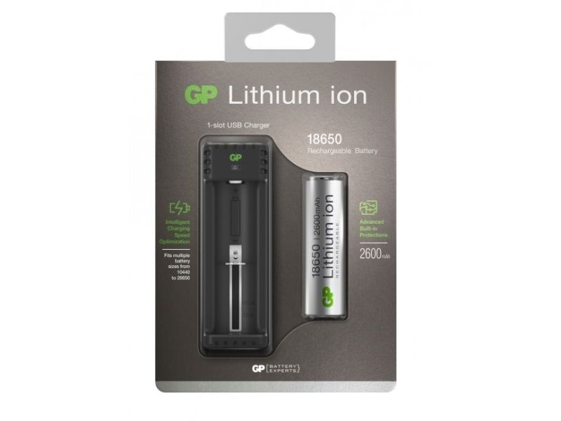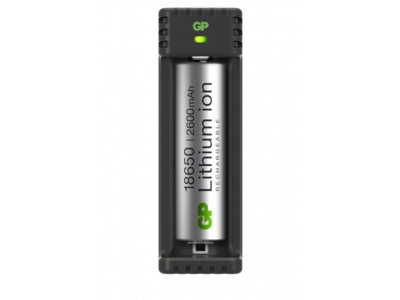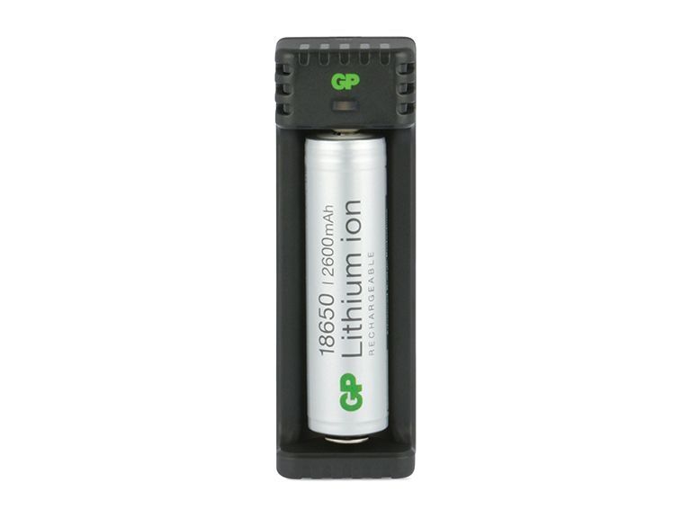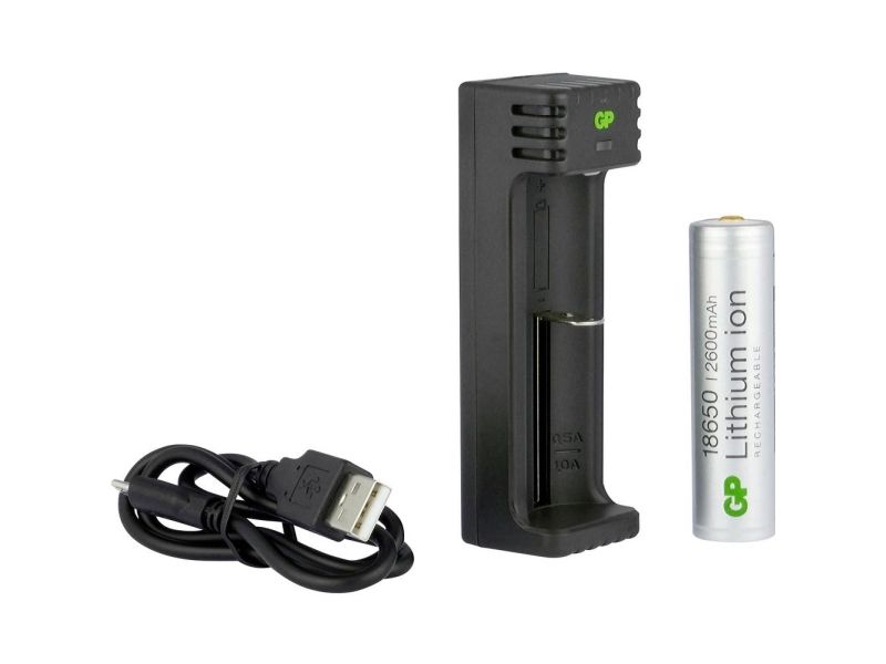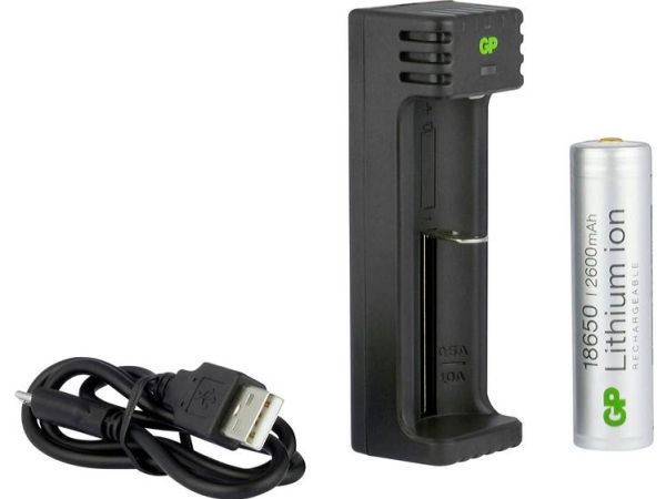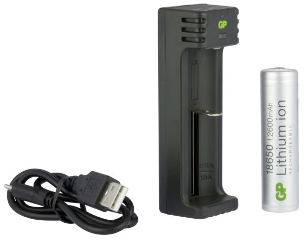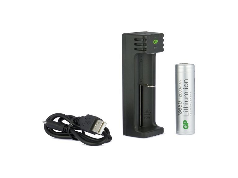 Medfølger: Micro USB-ladekabel, 1 stk. GP 18650 Li-ion batteri