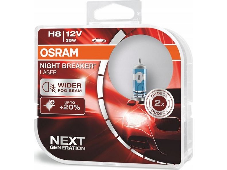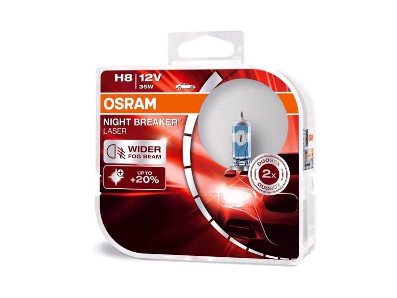 Osram Night Breaker Laser H8 er en halogenforlygtepærer som lyser op til 150% kraftigere sammenlignet med den lovmæssige minimumsstandard. Det højkonstruerede filament sikrer et ekstra lysboost. Som følge heraf giver lamperne en op til 150 m lang lysstråle og op til 20% hvidere lys sammenlignet med den mindste lovmæssige standard.