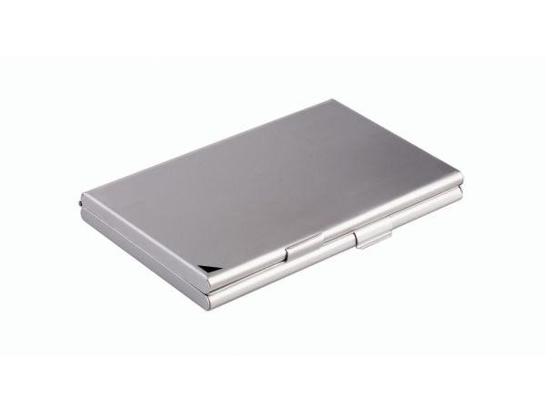 Aluminum business card case with two separate compartments for 10 personal and 10 customer business cards up to 90 x 55 mm in size. Color: silver.