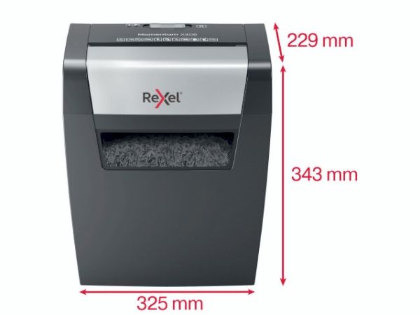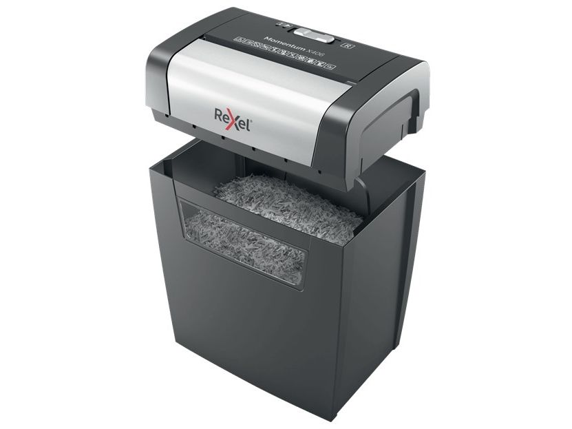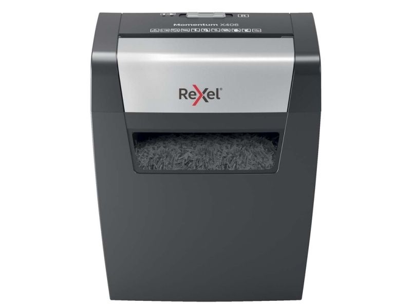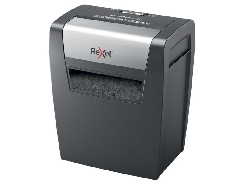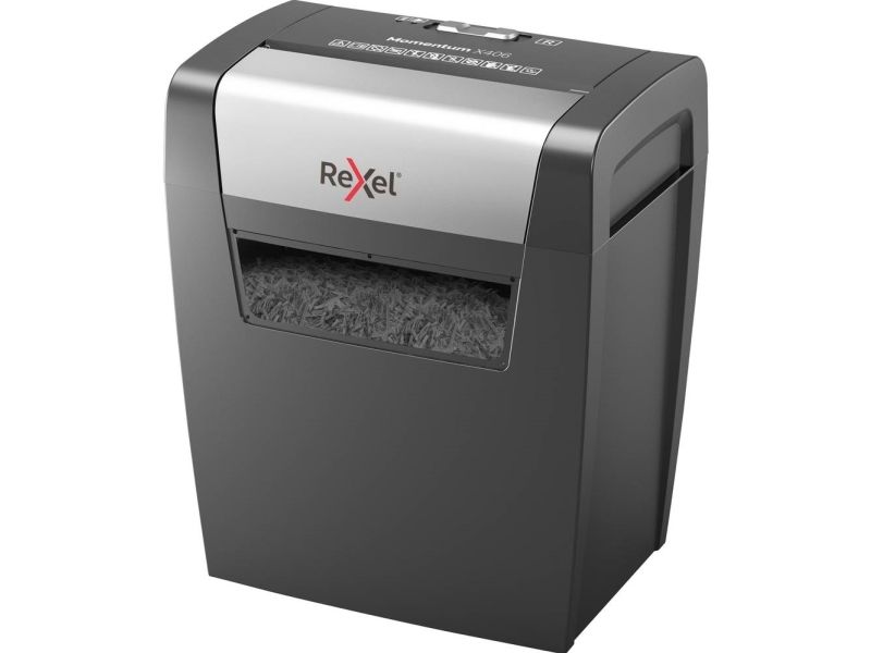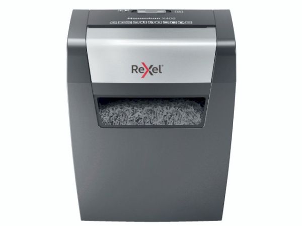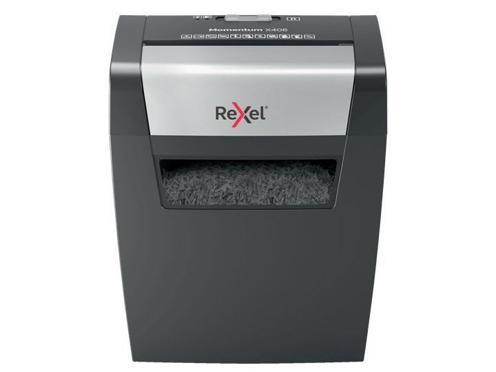Kraften til at makulere mere! Rexel Momentum X406 makuleringsmaskine makulerer op til 6 ark på en gang med 3 minutters konstant makuleringstid. Ideel til hjemmebrug. P4, krydsmakulering i 4x30 mm stykker. 15 liter beholder med 125 A4 ark kapacitet. - Makulerer op til 6 ark papir på en gang - Højt sikkerhedsniveau med P4, krydsmakulering 4x30 mm stykker - Makuler flere papirer i en længere periode med 3 minutters konstant drifttid - Makulerer let adskillige dokumenter - også med hæfteklammer og papirclips i hjørnerne - 15 liter beholder med kapacitet på 125 A4 ark.