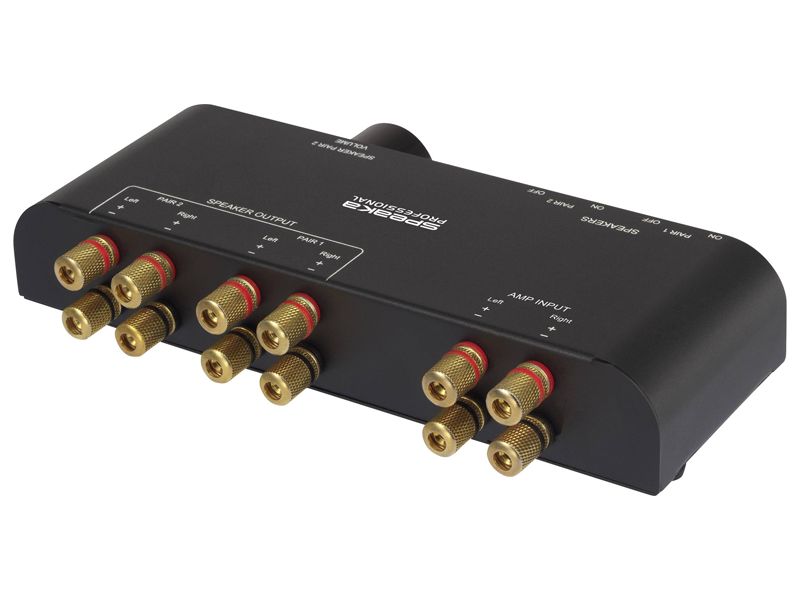 SpeaKa Professional 2-vejs højttaler-omskifter, der gør det muligt at bruge to højttaler-par til en forstærker. Parret kan kobles samtidigt eller separat.