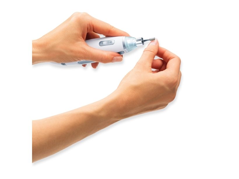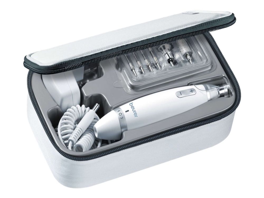 The Beurer MP 62 electric manicure/pedicure device offers a comprehensive solution for achieving salon-quality nail care at home. With a range of included accessories, such as a felt cone, cylindrical cutter, and fine sapphire wheel, this device caters to all personal care needs. The stepless speed adjustment allows for precise control, enabling users to select the ideal speed for detailed work, while the built-in LED light illuminates the area for greater visibility during use. With both clockwise and counter-clockwise operation, the MP 62 ensures versatility and ease of use, accommodating any preference for nail care techniques.