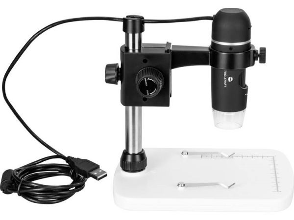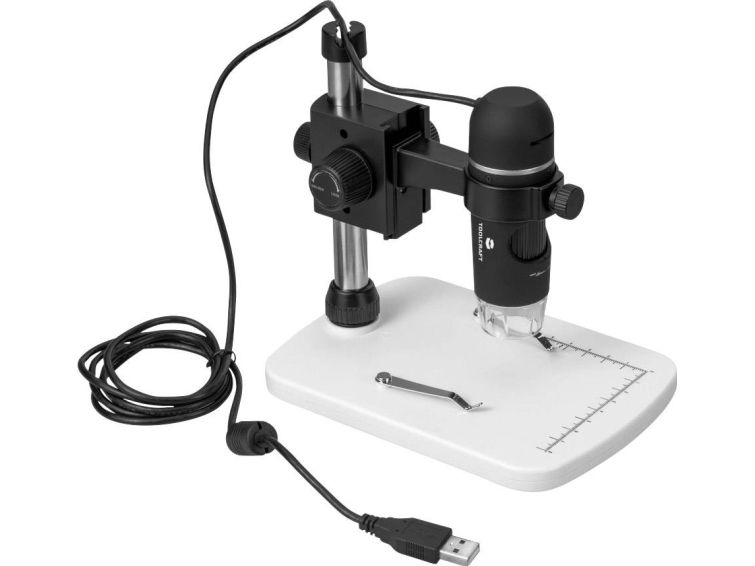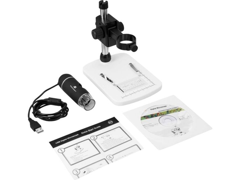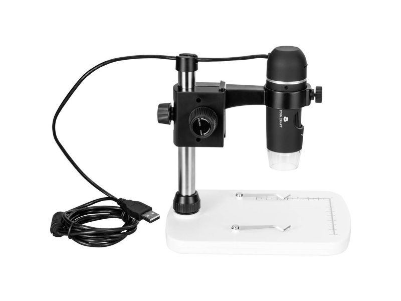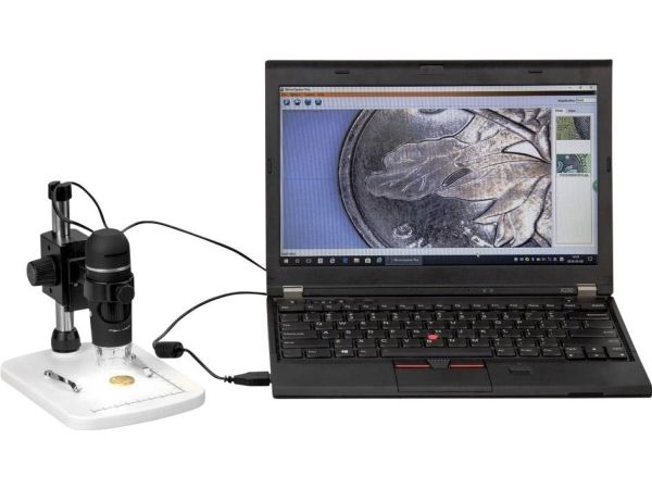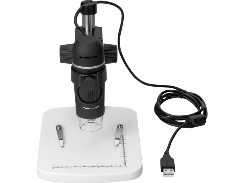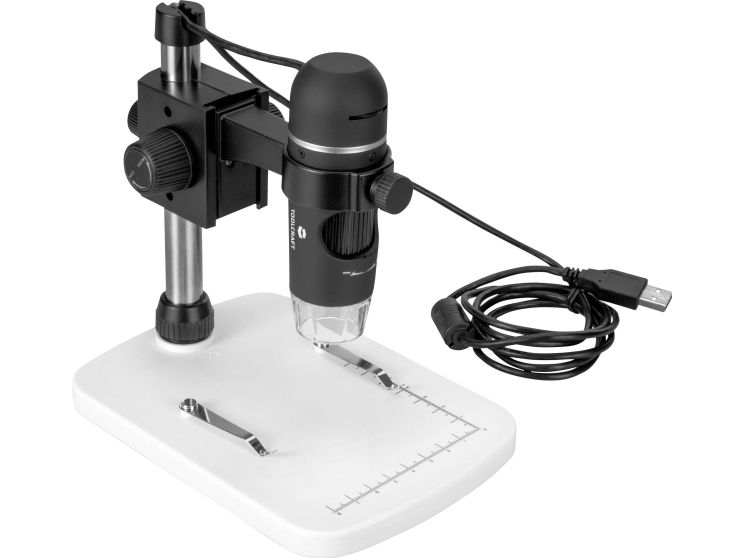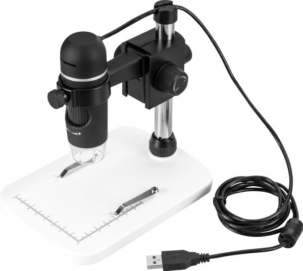 Digitalt mikroskopkamera DigiMicro Profi Software med kalibreringsfunktion til præcise målinger af afstande og flader på den forstørrede genstand · Dual Axis 27x & 100x · Mikroskoplinse · Belysning ved hjælp af 8 hvide LED · Indstillelig og låsbar fod. DigiMicro Profi har en Dual-Axis-linse. Focus-området er 10 mm til 150 mm. Takket være det præcist indstillelige stativ lykkes du også med de mere komplicerede optagelser. Yderligere udstyr omfatter 8 hvide LED til belysning af objektet og en specialsoftware til meget præcise målinger.