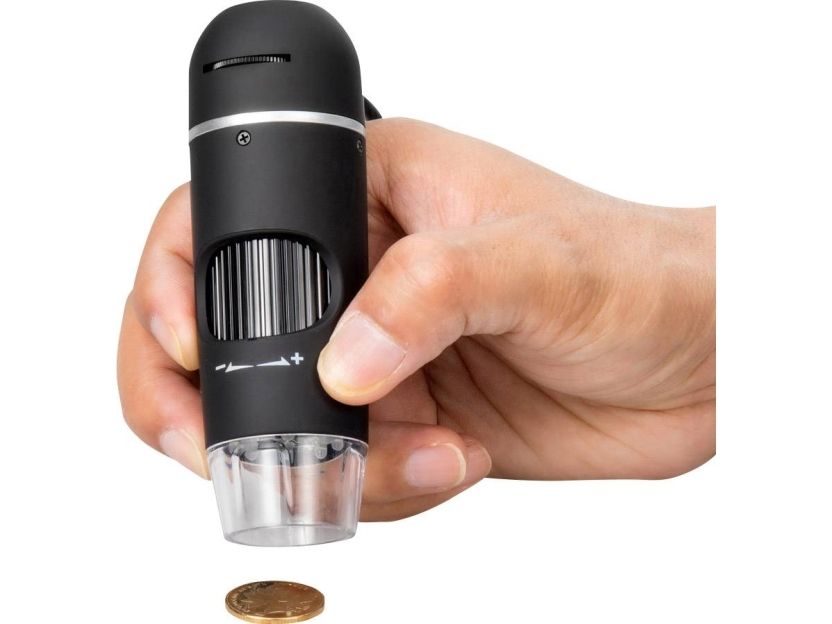 Anvendelsesområder – også ideel til brug i industri og forskning Den digitale teknologi åbner op for helt nye og spændende anvendelsesmuligheder. DigiMicro Mobile egner sig ikke bare til skolen eller hobbybrug, men også til forskning og arbejde, for eksempel ved industriel overfladekontrol. Ved et enkelt tryk på en knap kan de billeder og videoer, som mikroskopet har taget, blive gemt, arkiveret eller sendt pr. e-mail til venner, bekendte eller også handelspartneren. Kameramikroskop med 5 mio. pixel Op til 150x forstørrelse Fleksibelt indstillelig fod