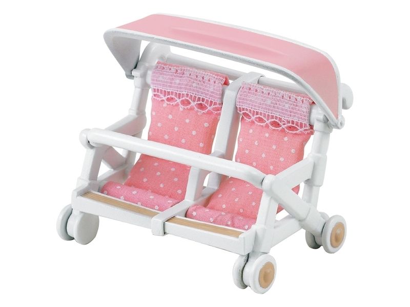 Tvillingsportsvognen fra Sylvanian Families er perfekt for de søte samlefigurene. Hvis du ser dobbelt er denne tvillingsportsvognen den perfekte måten å passe på det lille tvillingparet ditt! I denne tvillingsportsvognen med hvit ramme kan babyene dine holde hverandre med selskap mens sikkerhetsstangen sørger for at de er trygge. Med rosa polkaprikker på setet og solbeskytter, er dette drømmevognen hvis du har tvillinger eller hvis du bare vil at to små bestevenner skal være sammen! Dette er en robust vogn som er perfekt for å ta med smårollingene dine til parken, eller kanskje bare på en rask tur gjennom engen. • Barnevogn til 2 babyfigurer • Med solbeskyttelse og setepute