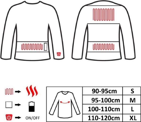 It’s also a perfect solution for bikers, construction workers, hunters, photographers and elderly persons. The most important features: The heating element is constructed from carbon fibres offering extraordinary reliability and durability as well as medical properties, thanks to infrared waves A safe and efficient Li-Ion battery provides a long time of operation of the heating system A pocket for storing the battery offers you comfort of use every day The heating element is located on the abdomen, in the area of the loins and on the shoulders, providing even heat distribution The thermoactive fabric allows for quick moisture absorption and has biostatic properties, thanks to which it supports the operation of the heating system