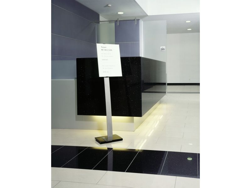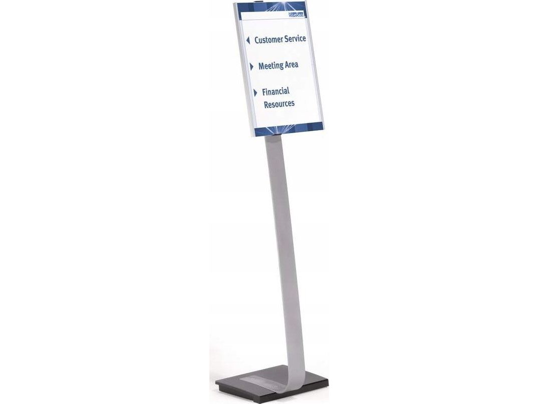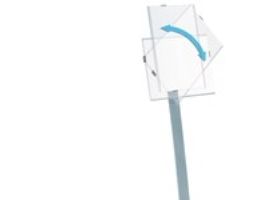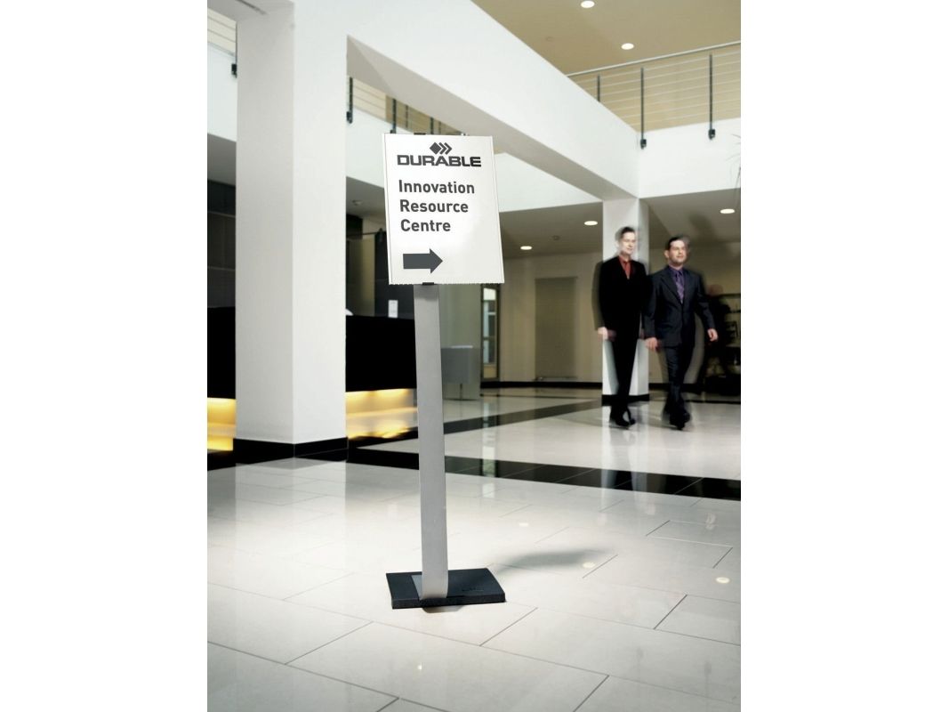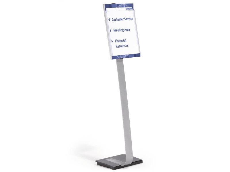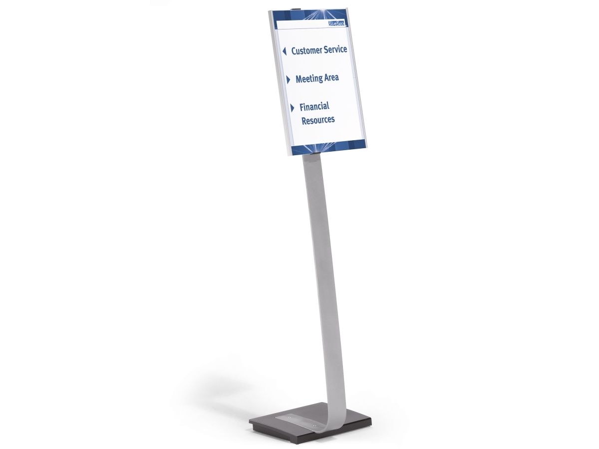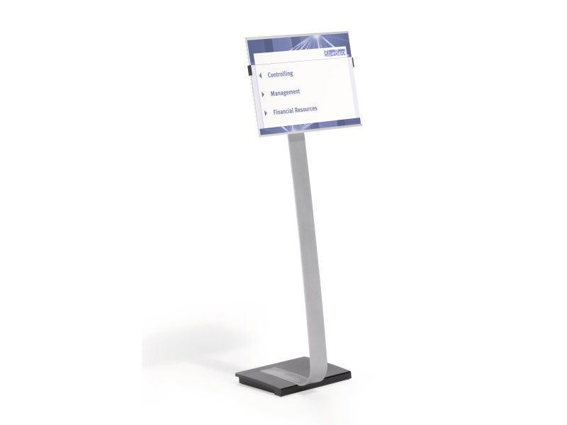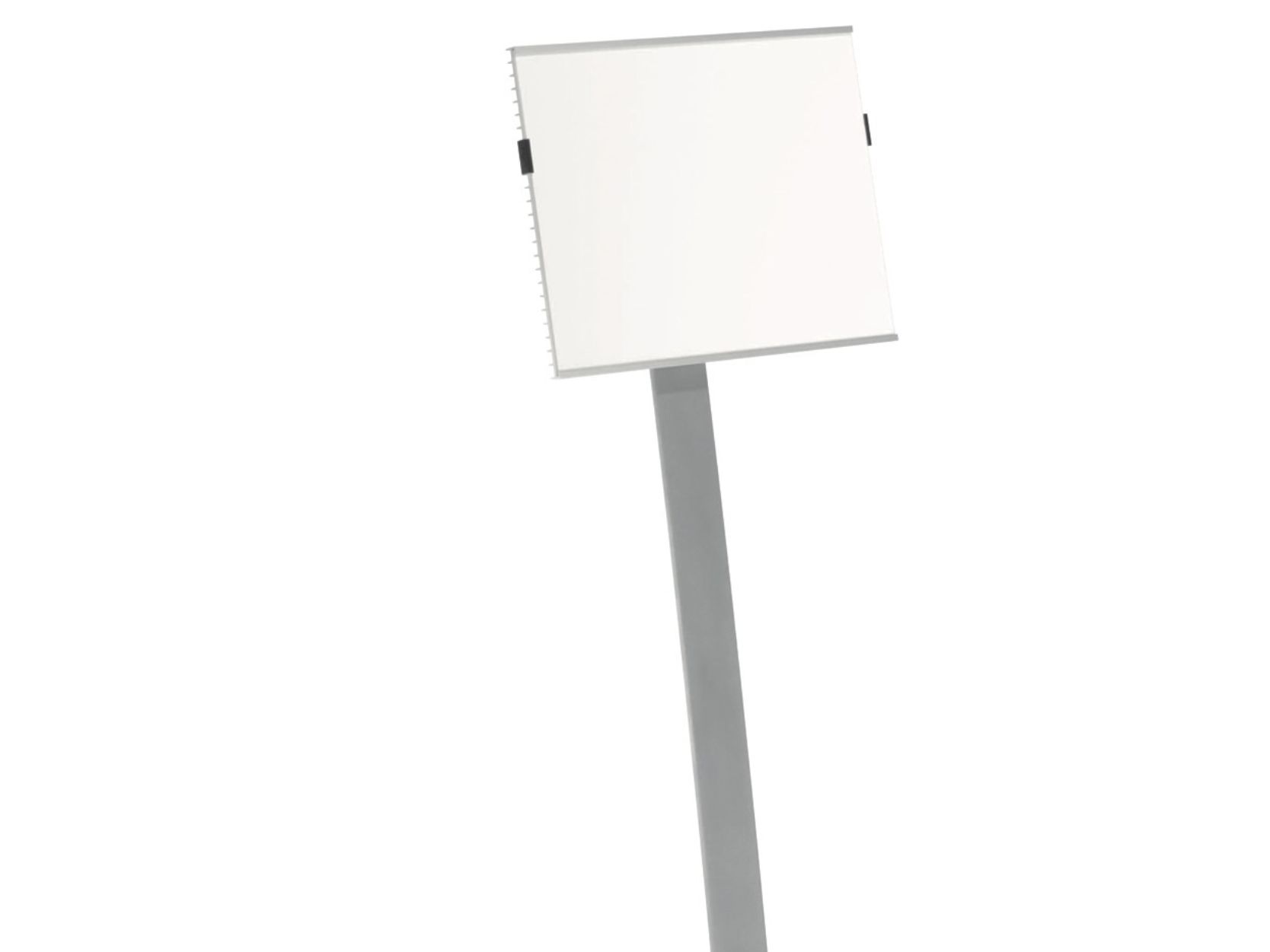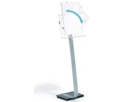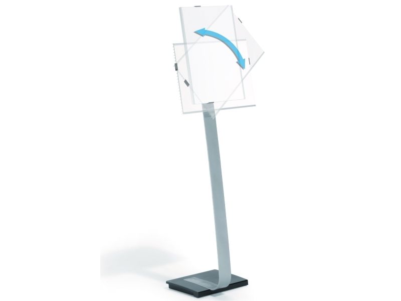 High quality aluminium floor stand with either an A4 or A3 acrylic INFO SIGN panel. Weighted base and rubber pads ensure stability. Using a catch mechanism, the anti glare panels can easily be rotated from portrait to landscape and are height adjustable. (A4 portrait: 1.18 m and 1.11 m; A3 portrait: 1.25 m and 1.18 m). The viewing angle of the panel is also adjustable by 10 degrees for optimal use.