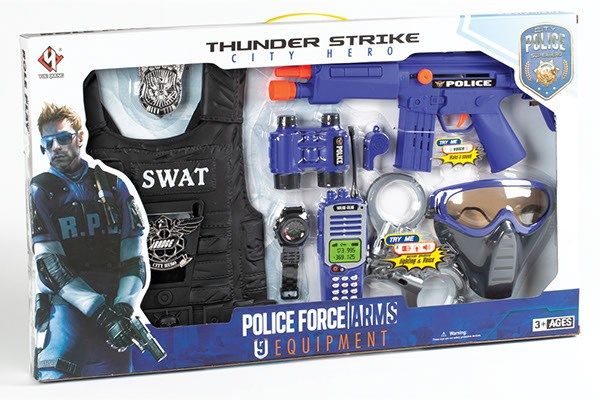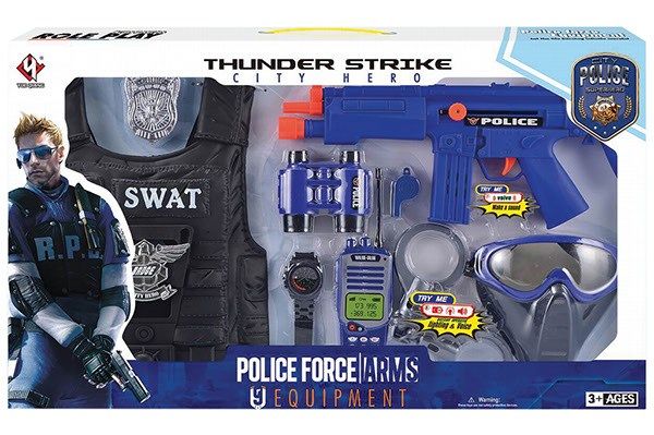 Dette store S.W.A.T sæt indeholder Skjold, håndjern, maske, maskingevær, fløjte, walkie-talkie og meget mere i hård plast til sjov leg.