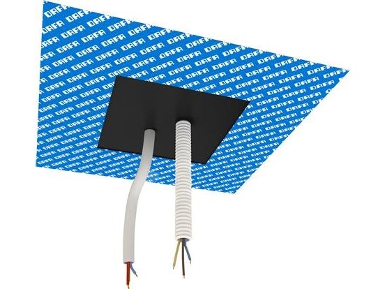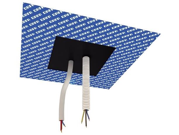 DAFA AirStop kabelkrave 195, 195x195 mm for tætning af PE-folie dampspærre med forstanset markering for Ø80 mm dåse og ø7-22mm kabel.