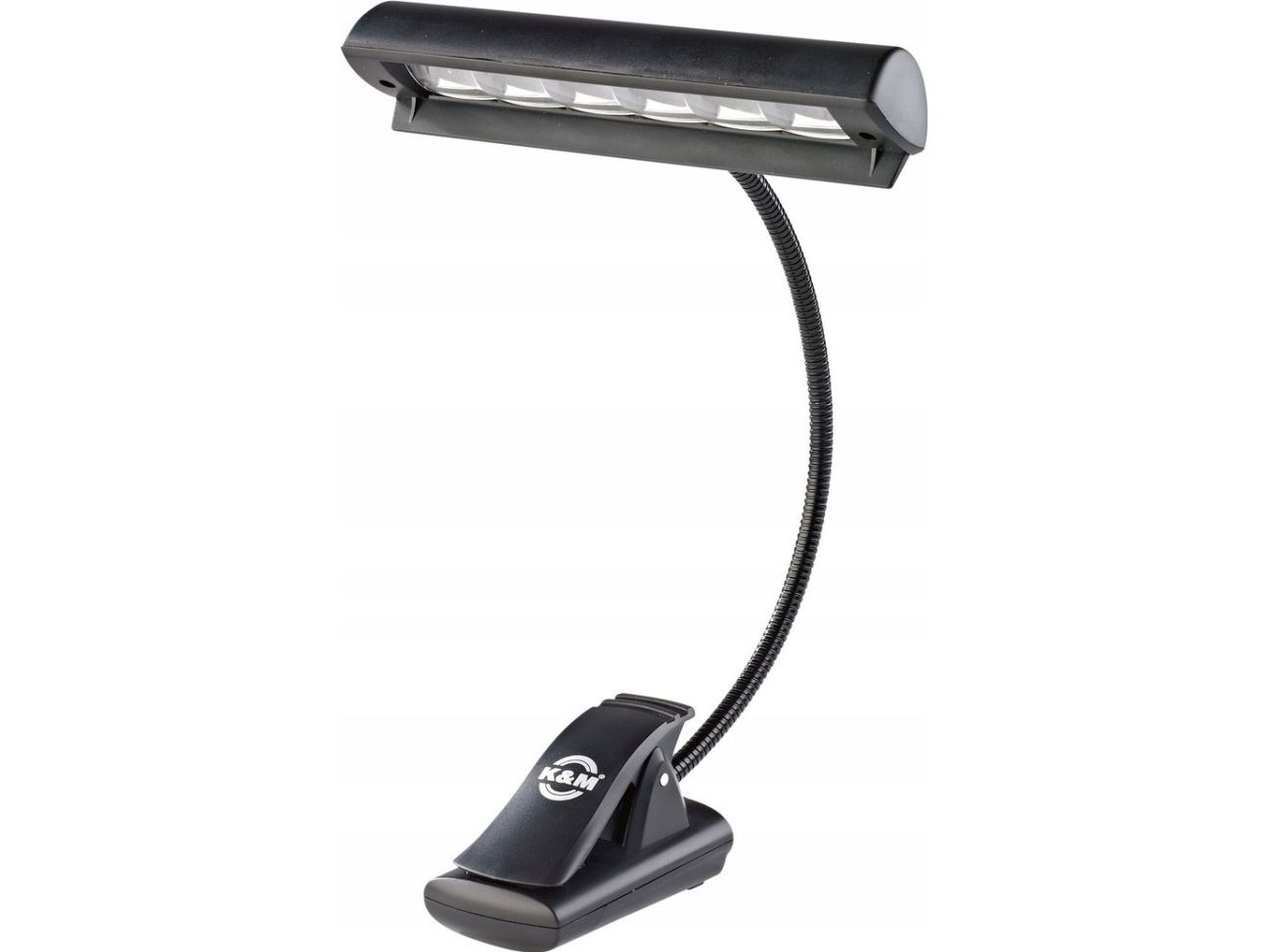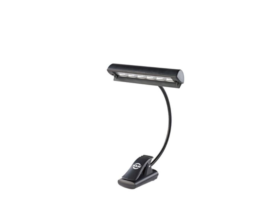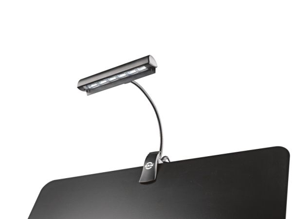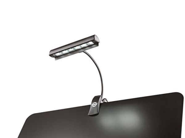 Attraktiv orkesterlampe med 6 kraftige LED'er som giver et jævnt lys med rig kontrast. Den fleksible svanehals er fuldt justerbar og lampen har 2 forskellige lysstyrker som vælges via trykknap. Orkesterlampen leveres med 3 stk. AAA 1,5 V batterier, 230V strømforsyning samt transporttaske.