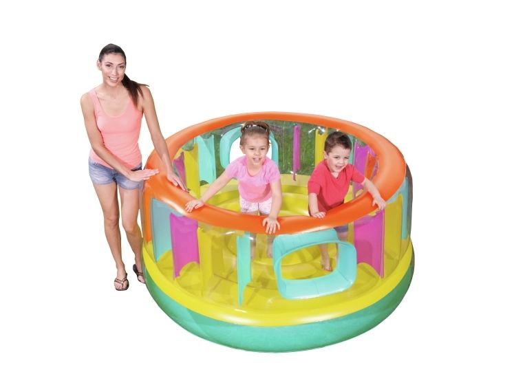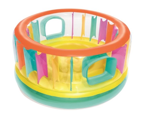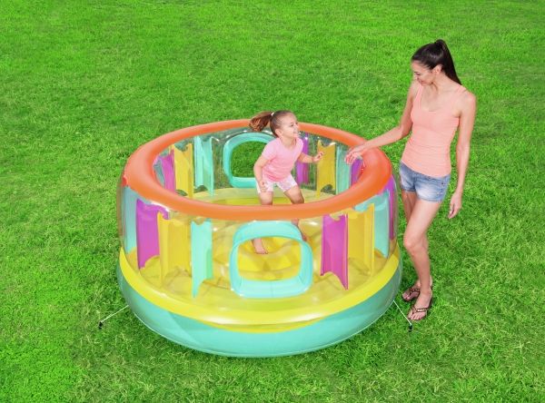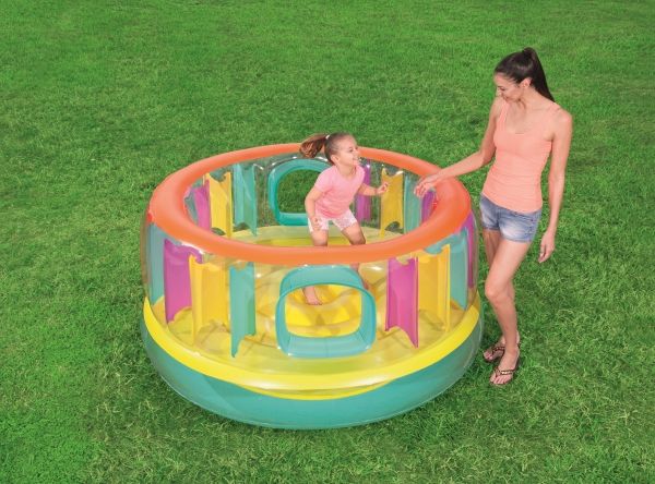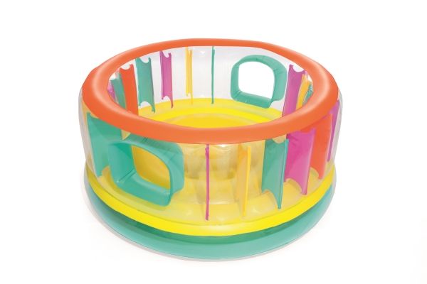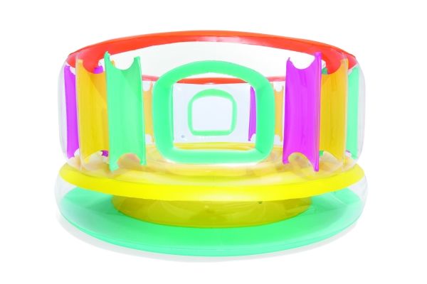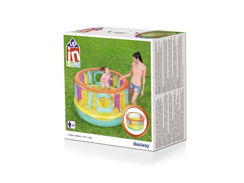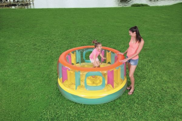 BounceJam hoppeborg * Sikkerhedsventiler * Robust gennemprøvet vinyl * Sidvægge i udfyldte farver giver ekstra sikkerhed * Vægtkapacitet: 85 kg (188 Lb.) * Kraftig reparationslap medfølger * Størrelse: Diameter 1,8M Højde: 86 cm Indhold: En hoppeborg, kraftig reparationslap