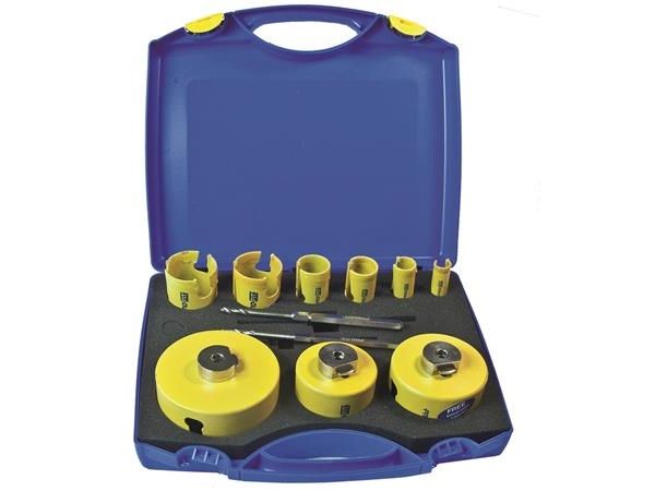 Anvendes i alle typer træsorter, sikrer den specielle vinkling af HM platten minimal støvudvikling (skære spåner), hulsaven skærer sig fri af materialet Ingen misfarvning af træet på grund af varmeudvikling ved brug afHM hulsavene Ingen fastbrændte fibre på HM hulsaven HM hulsaven bliver ikke varm, hulsaven kan berøres umiddelbart efter anvendelse Drill & Drop systemet er vedligeholdesesfrit. Indhold: 9 stk. HM Hulsave: 19, 25, 32, 35, 51, 54, 76, 92, 114mm 1 stk. Centerbor HSS DDH1MP t/HM 14-30mm - 8mm Skaft 1 stk. Centerbor HSS DDH2MP t/HM 32-330mm - 10mm Skaft Leveres i ProFit medium blå plastboks