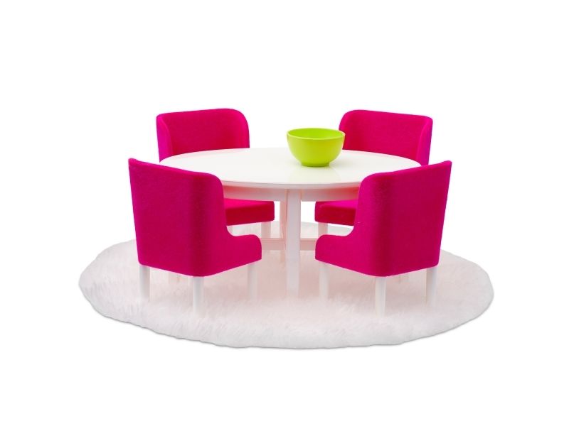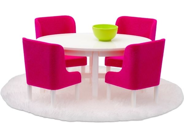 Lundbys elegante spisegruppe i en herlig farge som setter piff på spiseplassen! Samle Lundby-familien til et måltid i lekre rosa spisestoler rundt det hvite, ovale spisebordet. Det følger også med en fin grønn bolle og et mykt teppe i settet.