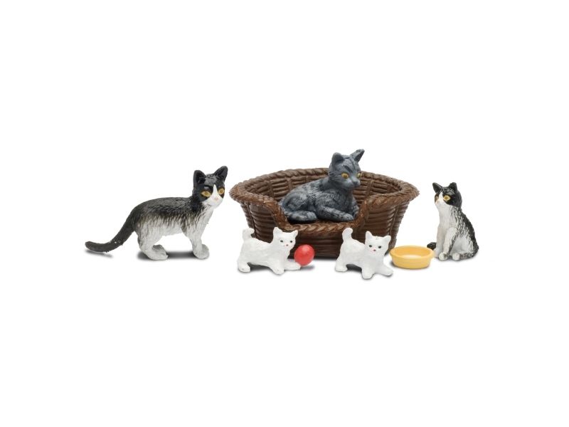 Det er ikke mye som er søtere enn en liten katt, så bare tenk deg en i miniatyr! I Lundbys herlige kattefamilie finner du tre katter og to små kattunger – og en av dem har fått tak i ballen! Når de blir trøtte etter all lekingen, har de en stor og fin kurv å hvile seg i. En matskål følger også med i settet.