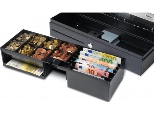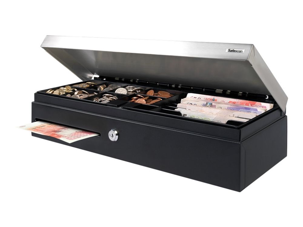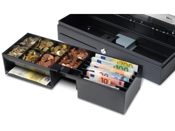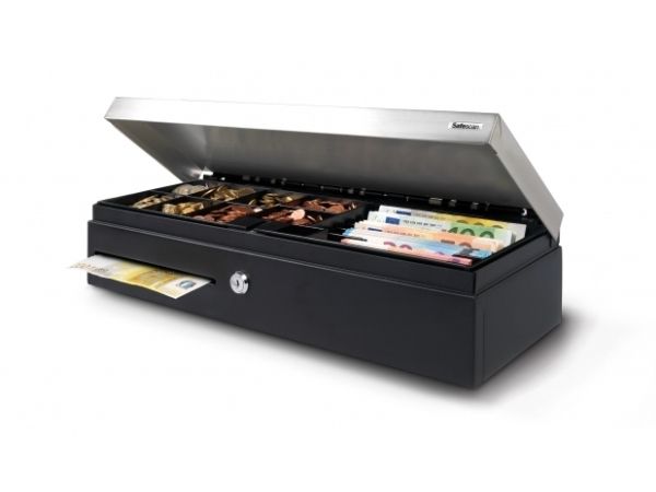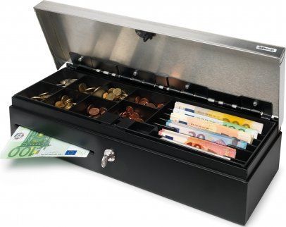 2 x nøkler, justerbar kasse (6 seddelspalter, 8 myntespalter)