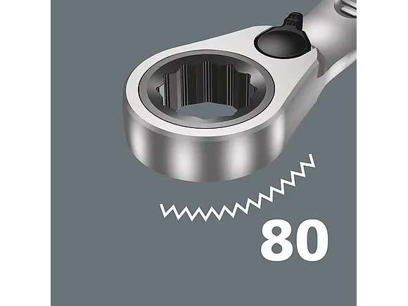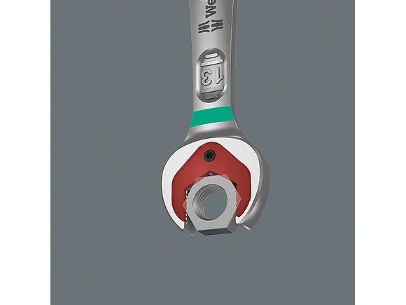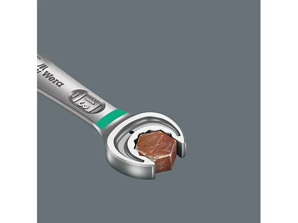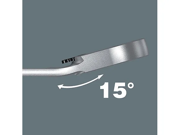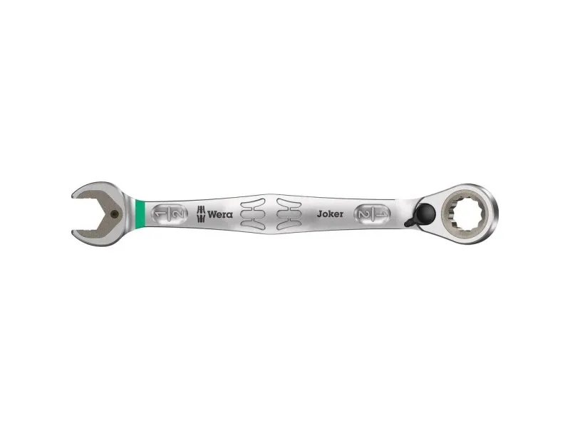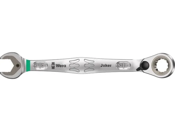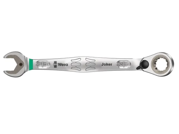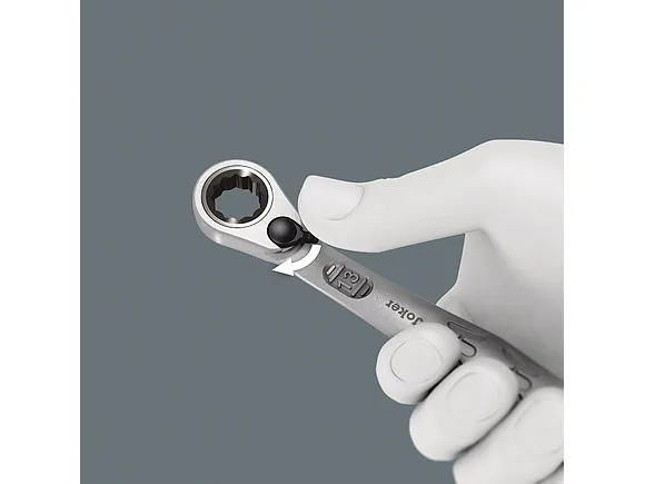 Joker ratcheting combination wrenches with angled ratchet head and switch lever. The metal plate in the jaw provides for the holding function which reduces the risk of losing nuts and bolts. The integrated limit stop can prevent any slipping from the bolt head downwards and enables higher torque to be applied. The exchangeable metal plate in the jaw securely holds nuts and bolts with its extra hard teeth and reduces the risk of slipping. The double-hex geometry delivers a very positive connection with nuts or bolts and again provides for a lower risk of any slipping. The low return angle of only 30° at the jaw end avoids any time-consuming flipping of the wrench when fastening. The reversible ratchet mechanism at the ring end with its fine toothing (80 teeth) ensures great flexibility even in confined spaces. Audibly precise ratchet mechanism. Additionally, the robust two-piece locking element provides for an extreme stability. Comes with a 15° angled ratchet end for secure work even at high torque. The special forged geometry allows for high torque transfer and high flexural rigidity. Manufactured out of high-performance chrome-molybdenum steel with a nickel-chromium coating for high corrosion protection. With "Take it easy" tool finder: colour coding according to size.