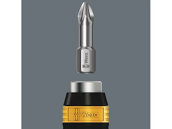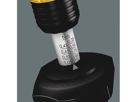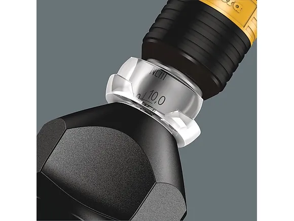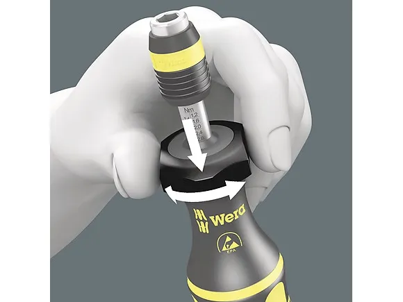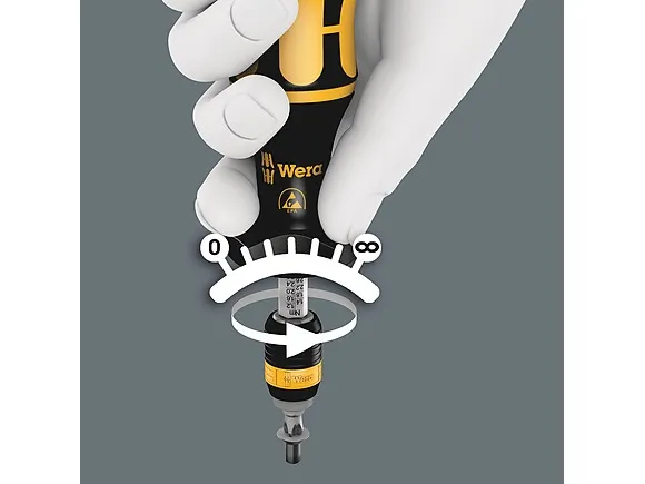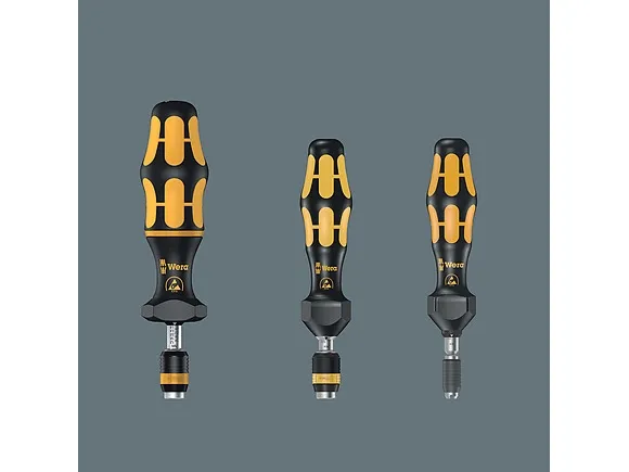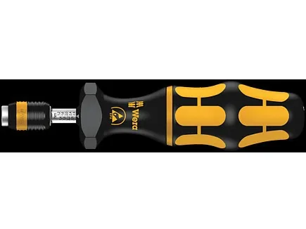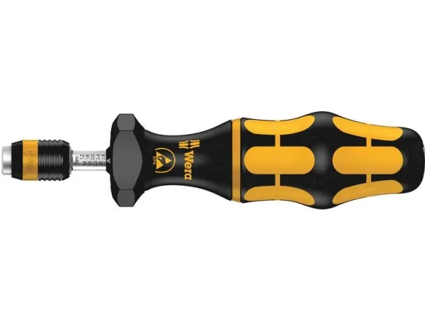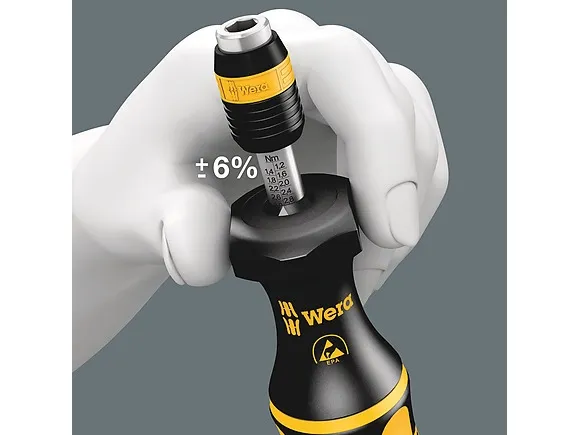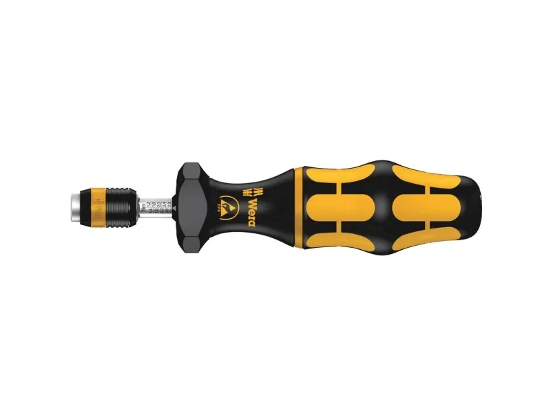Wera torque screwdriver. Dependable protection against electrostatic energy and associated damage. Variable torque setting option with highest precision. Simple adjustment of the required torque value without any special tools. Easy-to-read scale value. Rapidaptor quick-release technology for rapid bit change. Unlimited torque to loosen seized screws. Multi-component Kraftform handle with hard and soft zones for high working speeds, whilst being easy on the hand. Suitable for bits with 1/4" hexagon head drive as per DIN ISO 1173-C 6.3 and E 6.3 (ISO 1173).