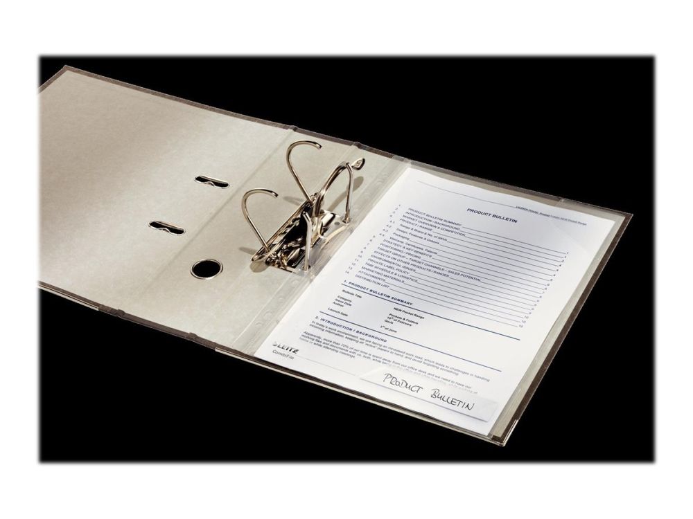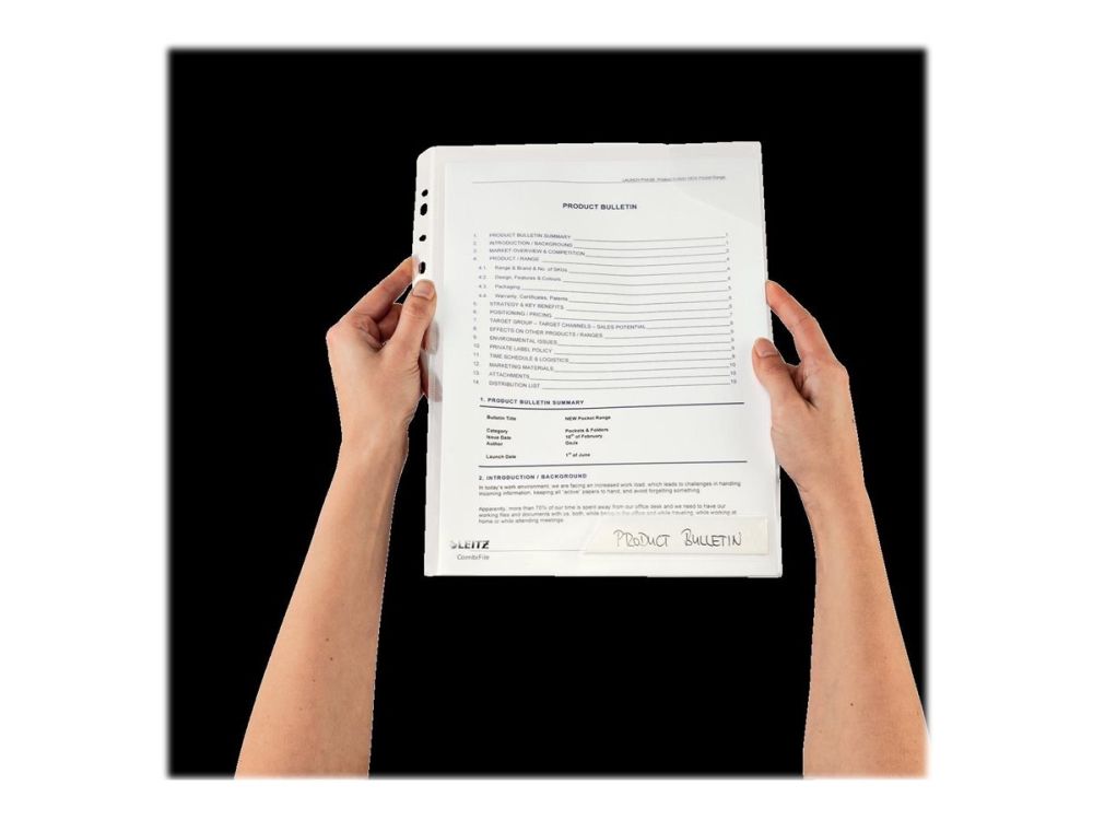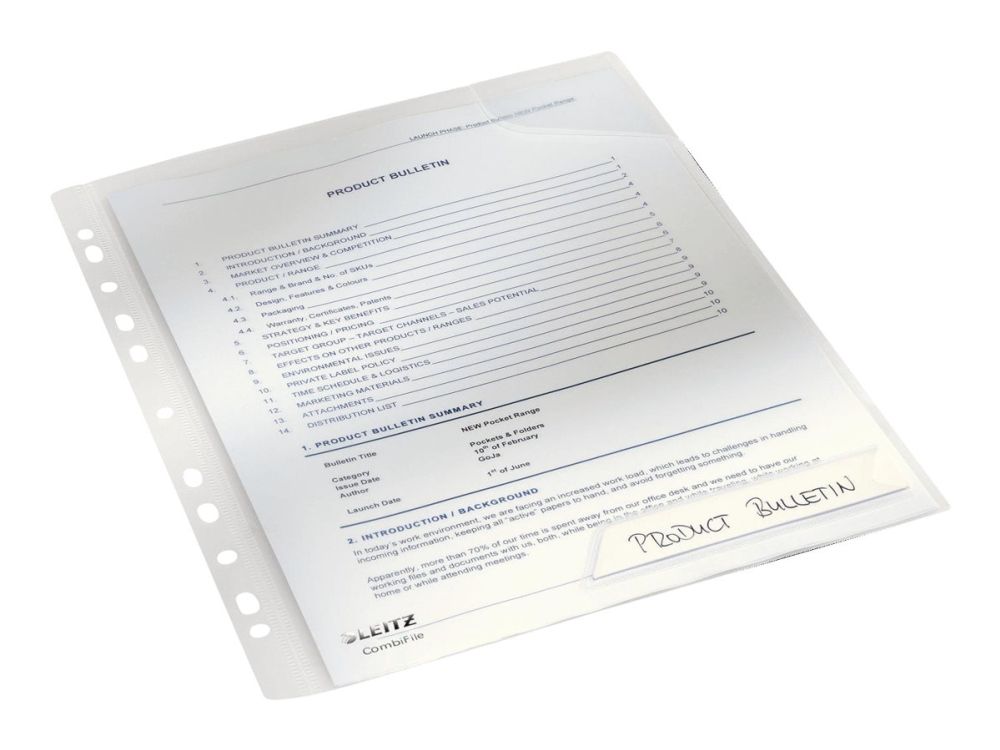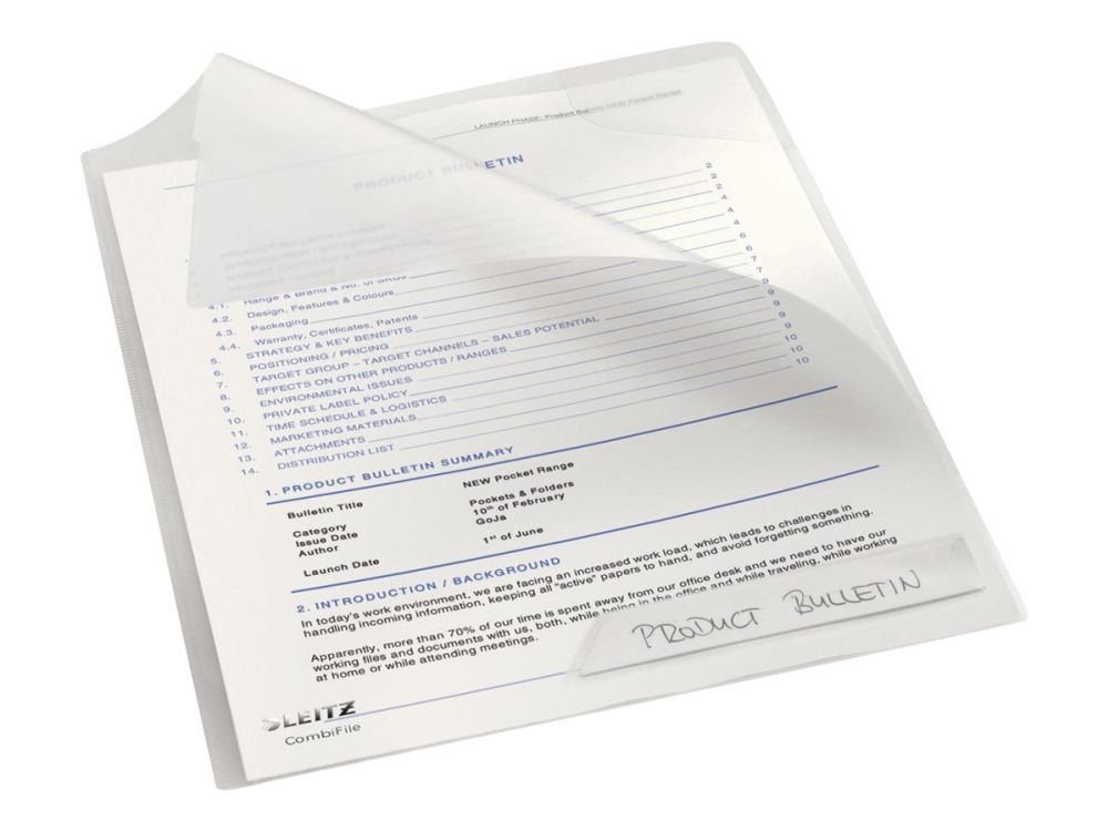 Kombinasjonen av omslag og lomme, gir stor fleksibilitet. Flik i hjørnet holder dokumentet på plass. Unik, patentert utbrettbar hullkant.