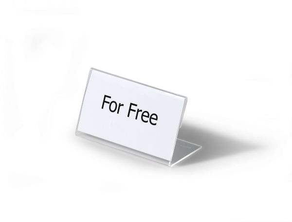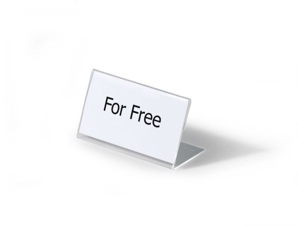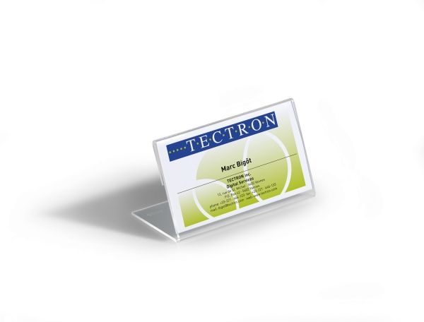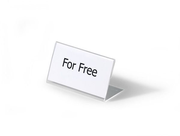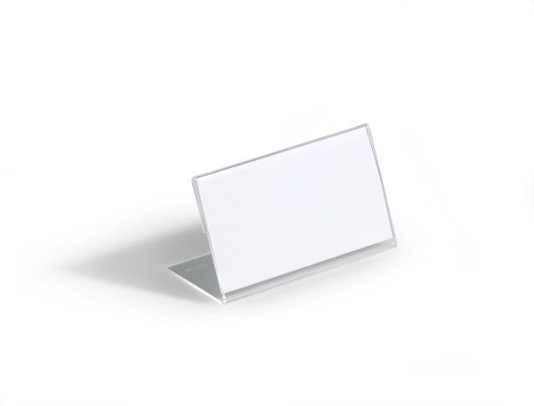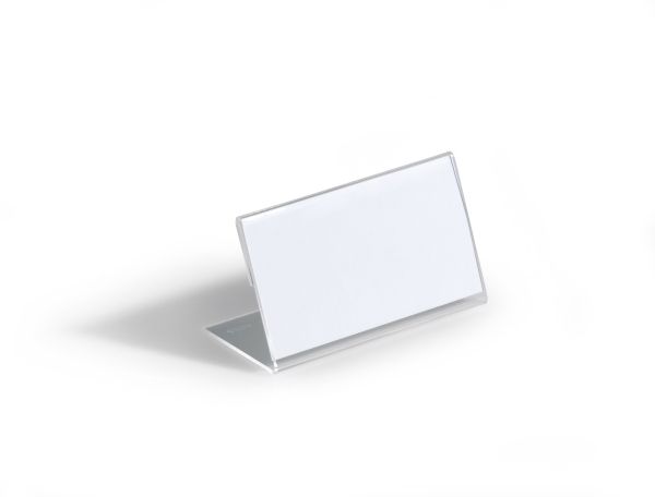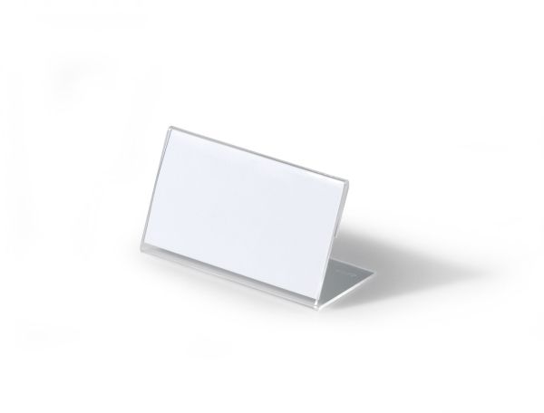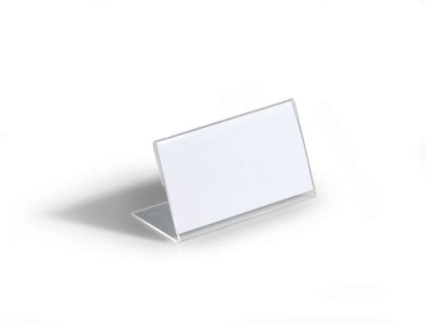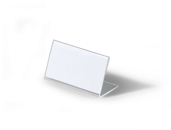 L-formet akryl holder til bordnavnekort til konferencer, mødet, prisskilte m v. Høj stabilitet takket være lange bund. Indstik medfølger. Mål indstik: 52x100mm (HxB). Indstiksetiket på A4 ark til udskrivning i printer kan bestilles separat (varenr. 145802). Design selv en personlig designet bordnavneskilte med gratis skabelon på www.duraprint.eu.