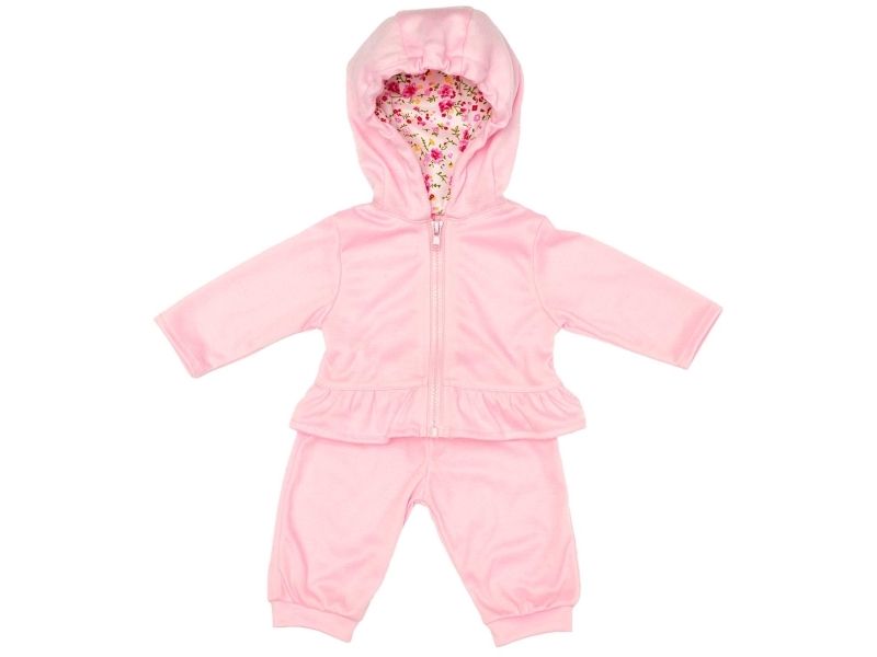 Skrållans rosa kosedress med volang er myk og deilig. Settet inneholder en jakke og et par bukser i myk jersey. Disse dukkeklærne passer perfekt til vår kosete Skrållan. Passer til dukker på 45 cm.