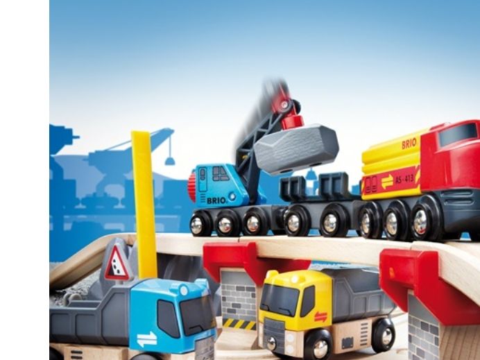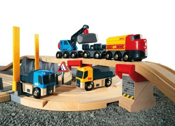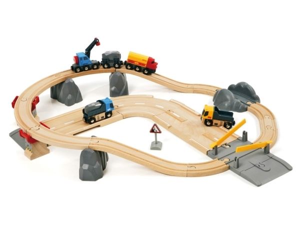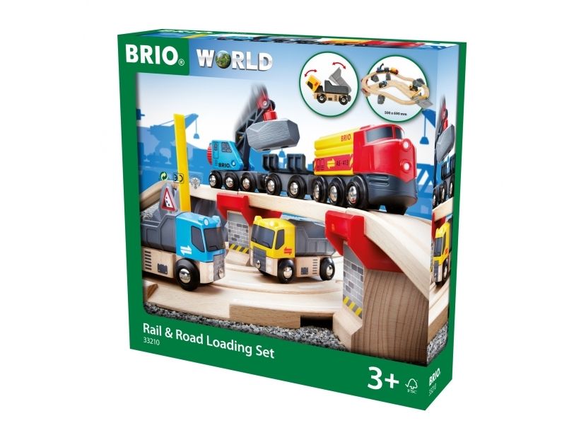 Rail & Road Loading Set Lift and load! This set is packed with lots of play, including two trucks and a train pulling a crane wagon that can lift loads on and off the track. Take the rock loads off the train and load them onto the trucks for a safe road transportation to the end destination.