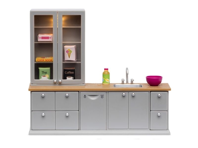 Kjøkkenet er selve hjertet i huset! Innred dukkehuset med en elegant, grå kjøkkenbenk, oppvaskkum og oppvaskmaskin med detaljer av tre. Kjøkkenet har skap og skuffer som kan åpnes og lukkes, samt et vakkert vitrineskap med batteridrevet LED-belysning. Lampen tennes med et enkelt klikk på den lille knappen på kjøkkenbenken og slukkes automatisk etter 15 minutter. 1 batteri (CR2032) medfølger.