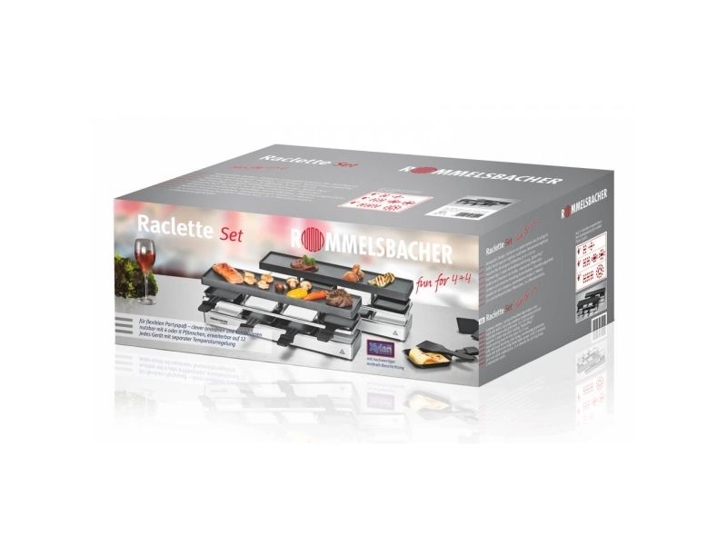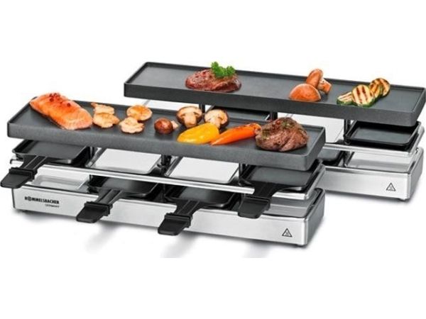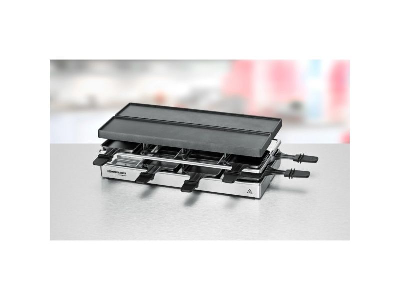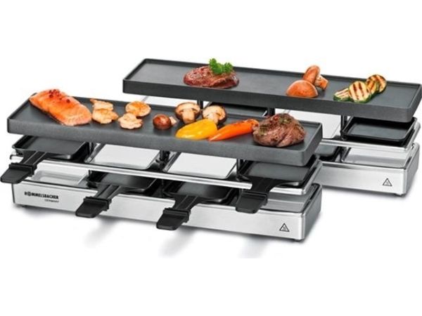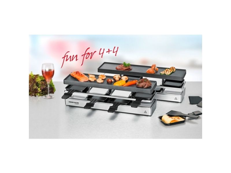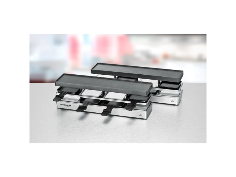 The elegant raclette & grill series is flexibly combinable at your table and leaves nothing to be desired. Its superior materials and excellent finish make it a real party star. Thanks to its stable aluminum-cast casing, the appliance stands securely and the solid grill plate ensures optimum heat distribution. Its temperature can be adjusted indefinitely variably just as required. Meat and sausages and also fish and vegetables come out perfectly on this grill plate. You can cook au gratin 4 different snacks in your pans at the same time on each appliance or melt your raclette cheese. During pauses you can store used pans safely and place-savingly in the integrated parking level. The superior non-stick coating of the grill plate and the pans cater for especially convenient handling and ensure swift cleaning. As special feature of this series, you can combine up to three individual appliances via connector cable. Since it can be upgraded to up to 12 pans, great raclette and grilling fun is guaranteed even with larger groups!