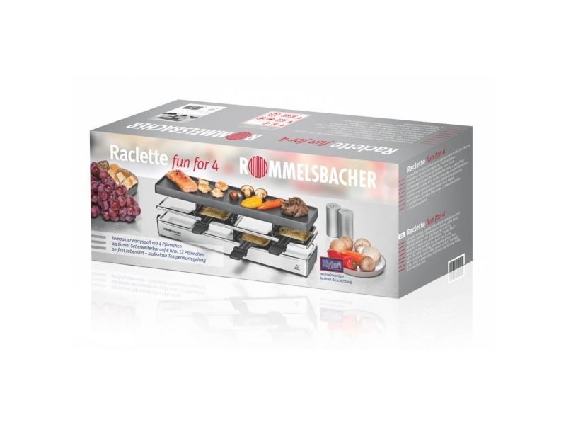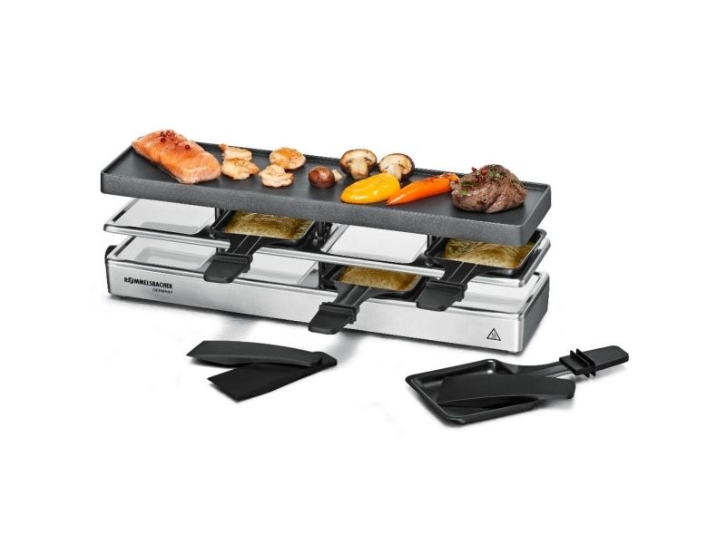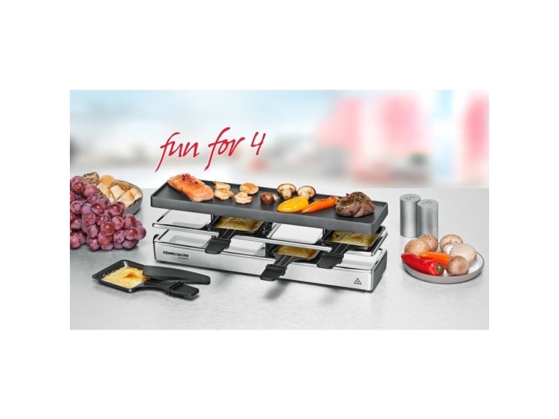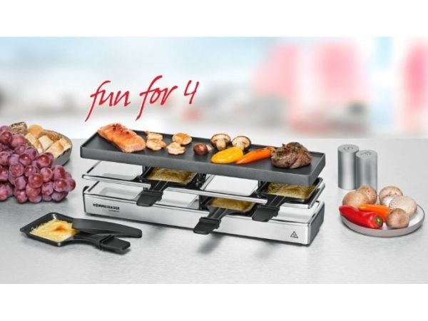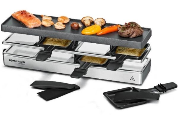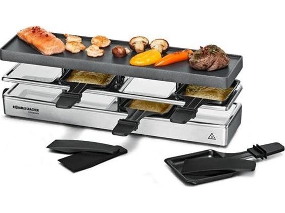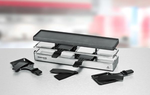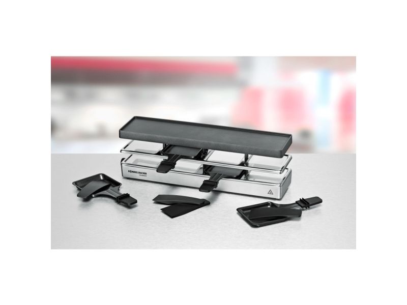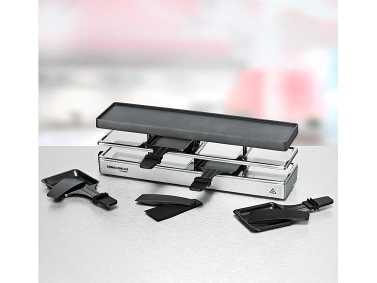 The elegant raclette & grill series is flexibly combinable at your table and leaves nothing to be desired. Its superior materials and excellent finish make it a real party star. Thanks to its stable aluminum-cast casing, the appliance stands securely and the solid grill plate ensures optimum heat distribution. Its temperature can be adjusted indefinitely variably just as required. Meat and sausages and also fish and vegetables come out perfectly on this grill plate. You can cook au gratin 4 different snacks in your pans at the same time on each appliance or melt your raclette cheese. During pauses you can store used pans safely and place-savingly in the integrated parking level. The superior non-stick coating of the grill plate and the pans cater for especially convenient handling and ensure swift cleaning. As special feature of this series, you can combine up to three individual appliances via connector cable. Since it can be upgraded to up to 12 pans, great raclette and grilling fun is guaranteed even with larger groups!