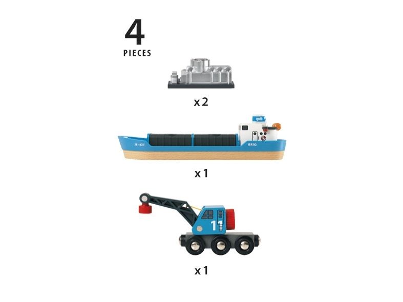 Skal bli, styrmann! Frakt lastes fra sjø til land med dette containerskipet. Bruk den bevegelige kranen for å sveive opp lasten og plasser den på en BRIO togvogn.