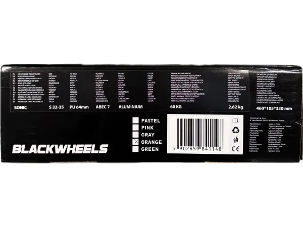 Sonic Blackwheels inline skøyter er utstyrt med en aluminiumsramme som fremmer kjøringens ergonomi. Det brukte aluminiumet er lett og gir rammen nødvendig stivhet. Hjulenes slitestyrke skiller seg ut, men også den høye styrken til den 5-ekede kjernen og felgen er viktig. Hjulene monteres til rammen med ABEC-7-lagre som gir jevn rotasjon og lang levetid.