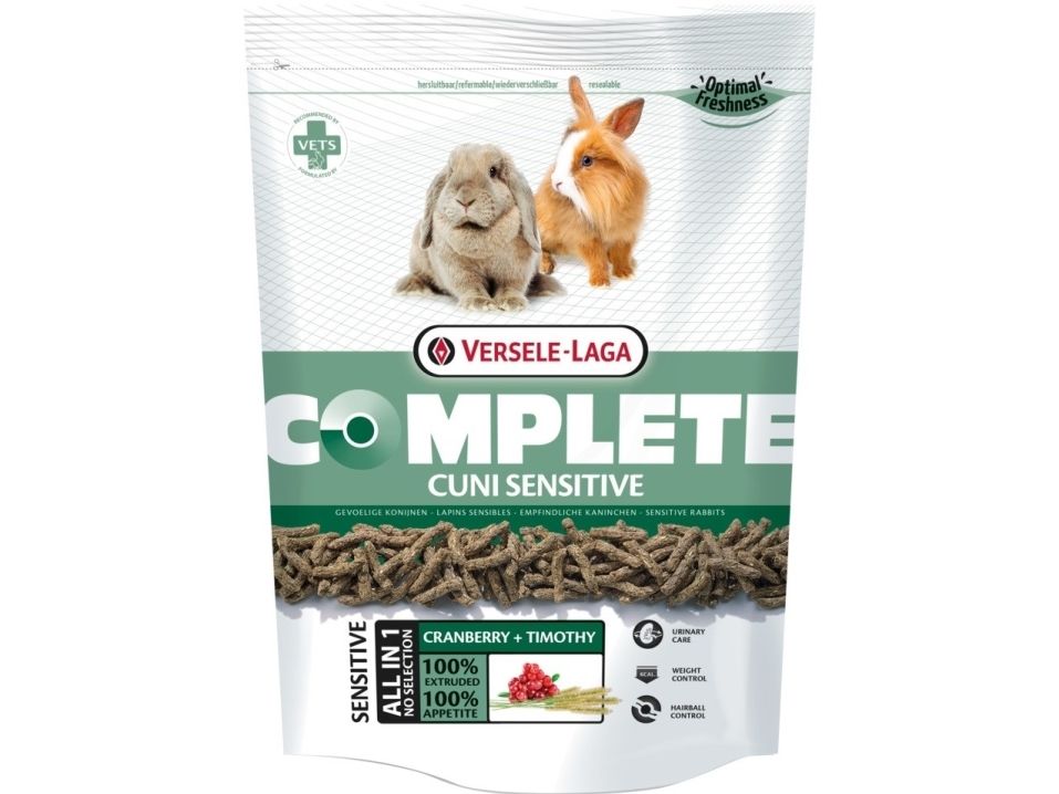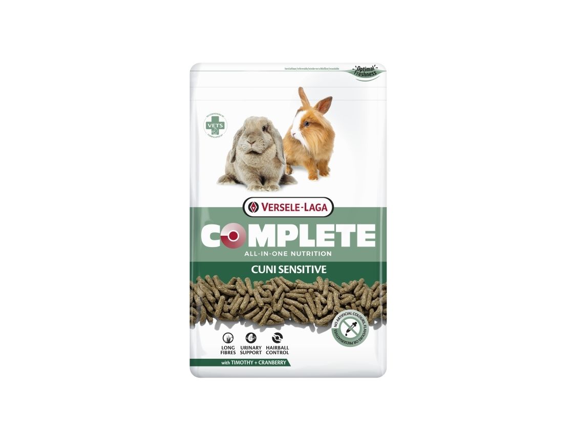 Versele-Laga Complete Kanin Sensitive är en spannmålsfri alternativ för äldre, mindre aktiva och känsliga kaniner. Det här 100% extruderade helfodret har en optimerad sammansättning med lägre energiinnehåll, särskilt anpassad för att bibehålla en hälsosam vikt hos kaninen. De speciellt utformade pelletsen har flera fördelar: de naturligt sliter ner kaninens framtänder, stödjer en balanserad tarmflora och friska urinvägar. Dessutom är fodret konstruerat för att reducera dålig lukt från avföringen och innehåller långa fibrer som gynnar en sund matsmältning.Se alltid till att din kanin har konstant tillgång till friskt vatten och hö av hög kvalitet. Med Versele-Laga Complete Kanin Sensitive ger du din äldre eller mindre aktiva kanin en näringsrik och skräddarsydd kost för att främja dess välbefinnande och hälsa. Beroende på kaninens storlek och ras rekommenderas en genomsnittlig daglig matdel på 40 till 70g.
