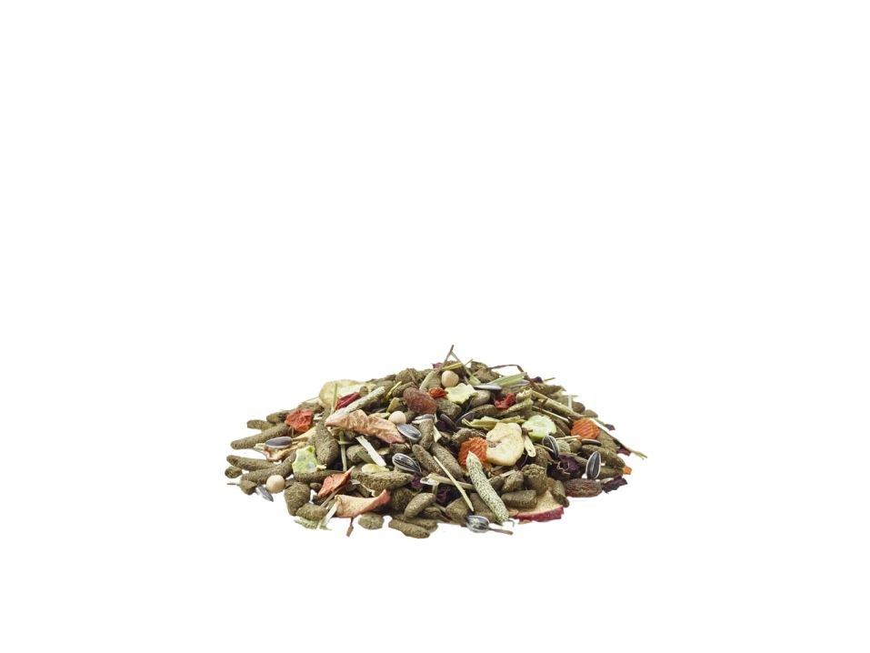 Marsvinsblandningen är berikad med extra gräs, örter och grönsaker som främjar marsvinets matsmältning, tandhygien och pälskvalitet. Den mångfaldiga blandningen av ingredienser säkerställer en god smakupplevelse. Det är viktigt att se till att ditt marsvin äter hela innehållet och inte bara väljer ut det mest lockande. Ge din vän den bästa näringen för en hälsosam och lycklig tillvaro. Uppdatera mat och dricksvatten varje dag. Beroende på storlek och ras rekommenderas en genomsnittlig daglig matdel på 40 till 55g för ett marsvin. Ge också gott om Dogmans delikatesshö för varierad kost. Kombinera gärna med Natursnacks för ytterligare variation för djuret.
