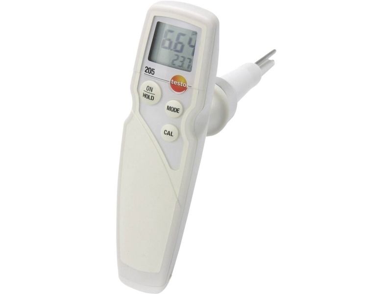 PH-måleapparat til levnedsmiddelområdet Testo 205 Kombinerede indstiksspids med temperaturføler · Automatisk slutværdiregistrering · 1, 2 eller 3 punktskalibrering. PH-måleapparat til seje plastiske medier. Tyngdepunktet ligger i kødtilberedning. Med den ergonomiske form og det overliggende display egner testo 205 ideelt egnet til anvendelse i produktionen, modtagelsen af og til hyppige målinger. Helt unik er den kombination af pH-indstikssonde og temperaturføler til præcis og hurtig temperaturkompensation. Automatisk registrering af en stabil måleværdi gør målingen lettere.