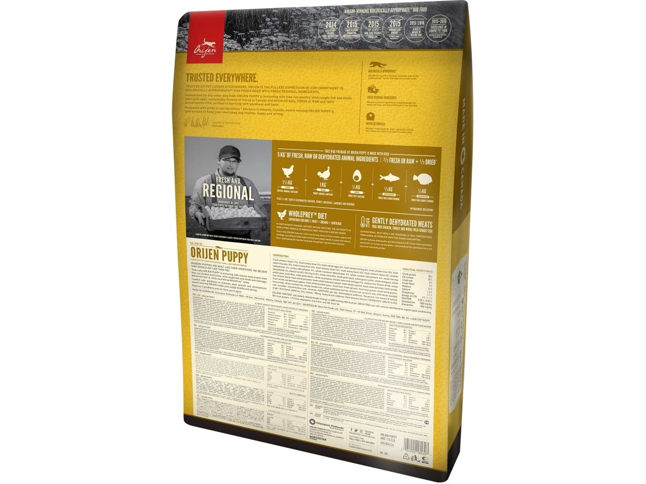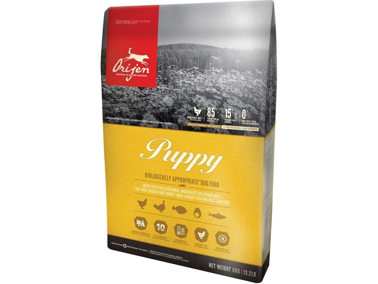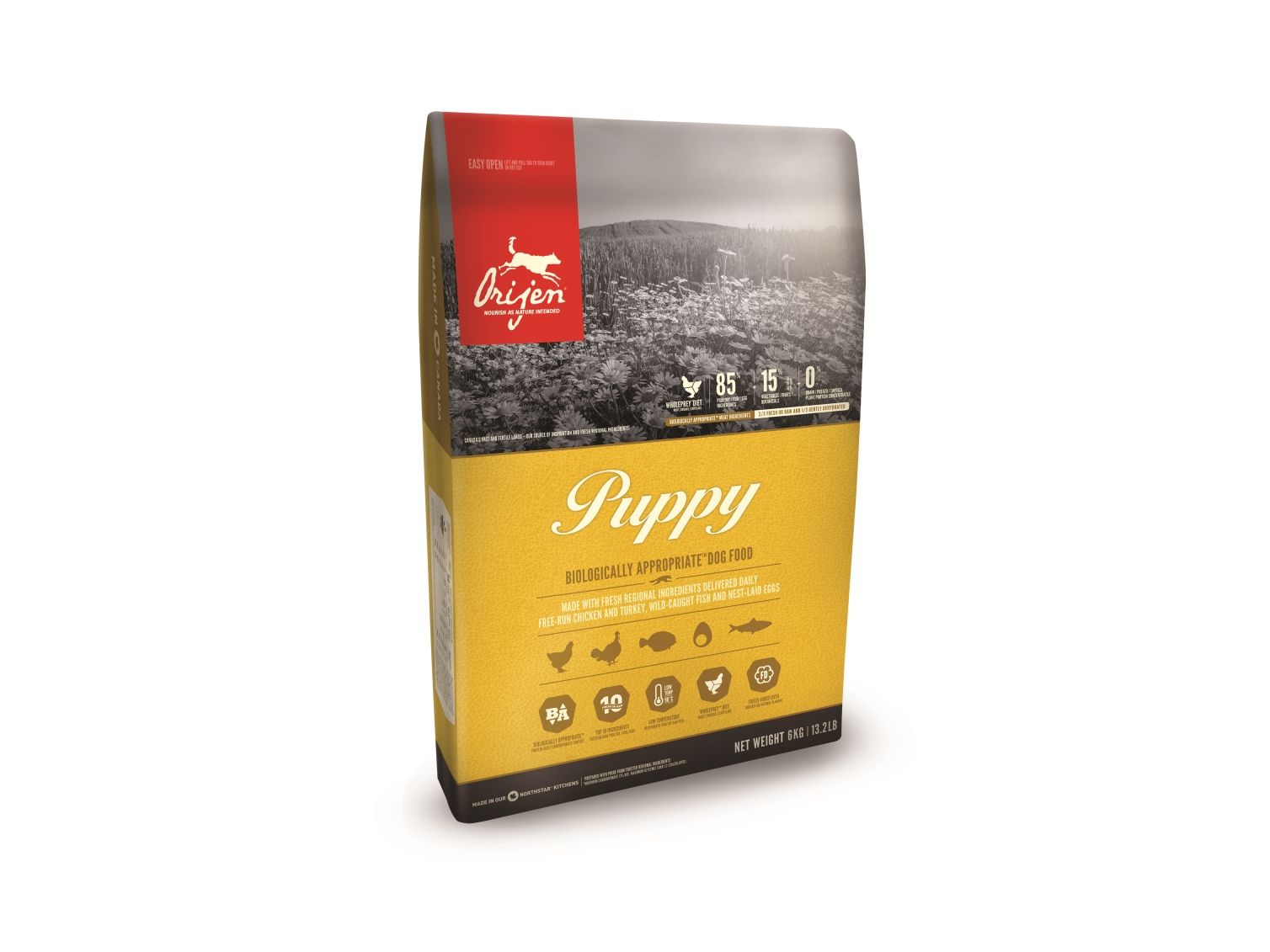 BIOLOGISK KORREKT© MAD TIL HVALPE. FRISK FRILANDS KYLLING OG KALKUN, REDELAGTE ÆG OG VILDTFANGEDE FISK. ALLE HVALPE BEHØVER EN KOST RIG PÅ PROTEIN OG FEDT FRA EN BRED VIFTE AF FRISK HEL KØD, FOR AT STYRKE OG UNDERSTØTTE DERES HASTIGE VÆKST OG UDVIKLING. Med 38% nærende proteiner, og begrænsede 17% lavt glykæmiske kulhydrater, sikrer ORIJEN at hvalpe ernæres i overensstemmelse med deres evolutionære og biologiske behov. Ulig noget andet hvalpefoder, er hele 2/3 af kødet i ORIJEN FRISK (nedkølet, ingen konserveringsmidler), eller RÅ (lynfrosset, ingen konserveringsmidler), hvilket også inkluderer de første 10 ingredienser. 1/3 af kødet er lufttørret ved 90°C, lavet af frisk kylling, kalkun og fisk, hvilket udgør koncentrerede kilder til rigt nærende proteiner der sikrer din hvalps vækst. Næringsrige WholePrey forhold af frisk kød, organer og brusk plus friske hele fisk og friske æg, udgør en naturligt stærk kilde til stort set alle næringsstoffer din hvalp behøver. Ingredienser som frysetørret kyllinge- og kalkunlever styrker smagen naturligt, og gør ORIJEN delikat selv for de mest kræsne spisere.