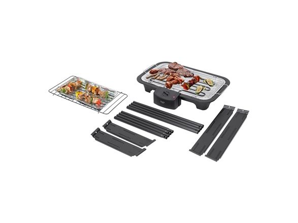 A safe griddle that can be used both during an outdoor picnic and on the verandah as well as inside the house. The power of 2000 W allows to quickly prepare a delicious best end of neck or sausages. Smooth temperature control and a thermostat´s control light ensure that a dish shall not be burned. The griddle is equipped with a safety power switch and with a removable heating element. The set contains a handy and steady base stand and a water drip to be placed under the grill and a heating element.