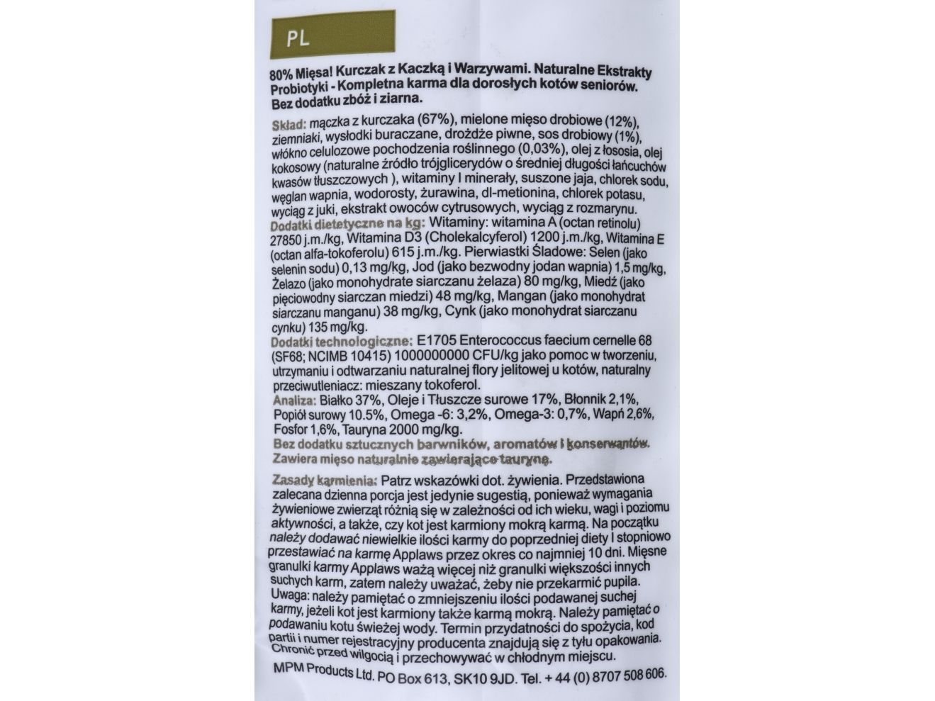 Protein 37%, Crude Oils and Fats 17%, Crude Fibre 3.4%, Crude Ash 10.5%, Calcium 2.6%, Phosphorus 1.6%, Omega 6: 3.2%, Omega 3: 0.7%, Taurine 2,000 mg/kg.