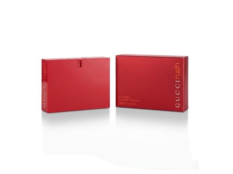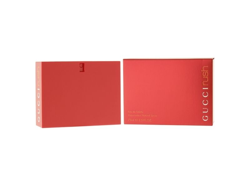 Perfume for her Gucci A Gucci Rush is an intoxicating mysterious oriental floral An addictive combination of California Gargenia South African freesia and coriander seeds A The name of the fragrance Rush reminds of stimulative drug very widespread in America during 1980s The intensive red bottle has the shape of a video cassette tape a very unusual and modern design A The top notes are gardenia and freesia the heart is created of jasmine Turkish rose and coriander the drydown unites vanilla patchouli and vetiver The fragrance has a lingering trace that follows the woman and surrounds her from all sides